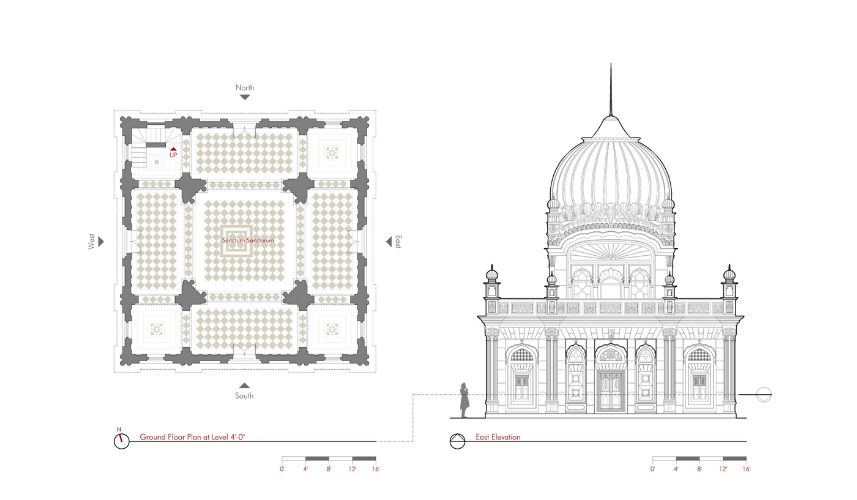 The Gurdwara's architectural elegance is reflected in its intricate details, as illustrated in the attached sectional drawings and elevations. The structure comprises British brick (measuring 3"x4.5"x9") with a cement plaster finish, originally in white, which remains vibrant even after decades. Influences of classical Greek architecture are evident in the Corinthian-style columns and cement-based decorative elements adorning the façade.