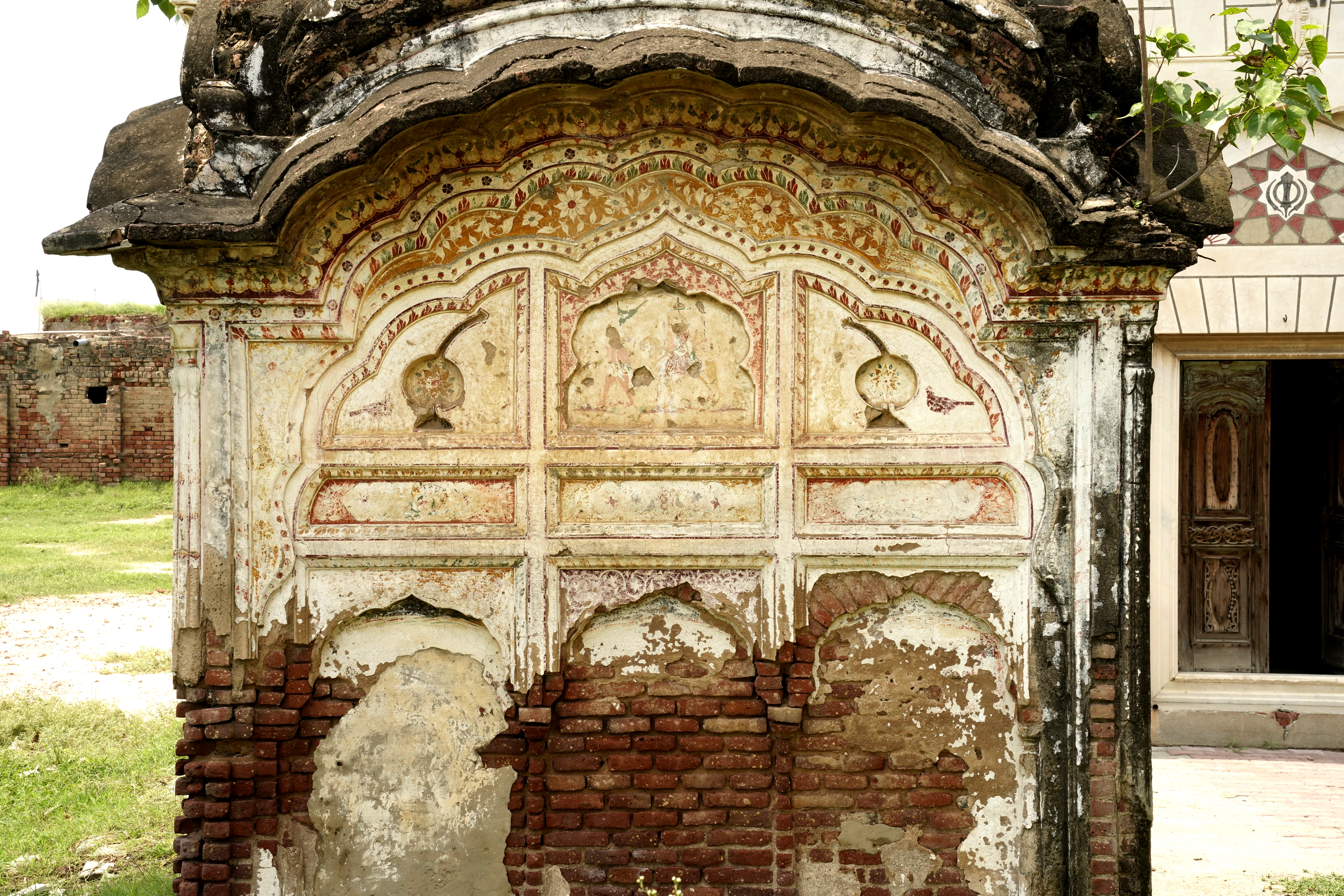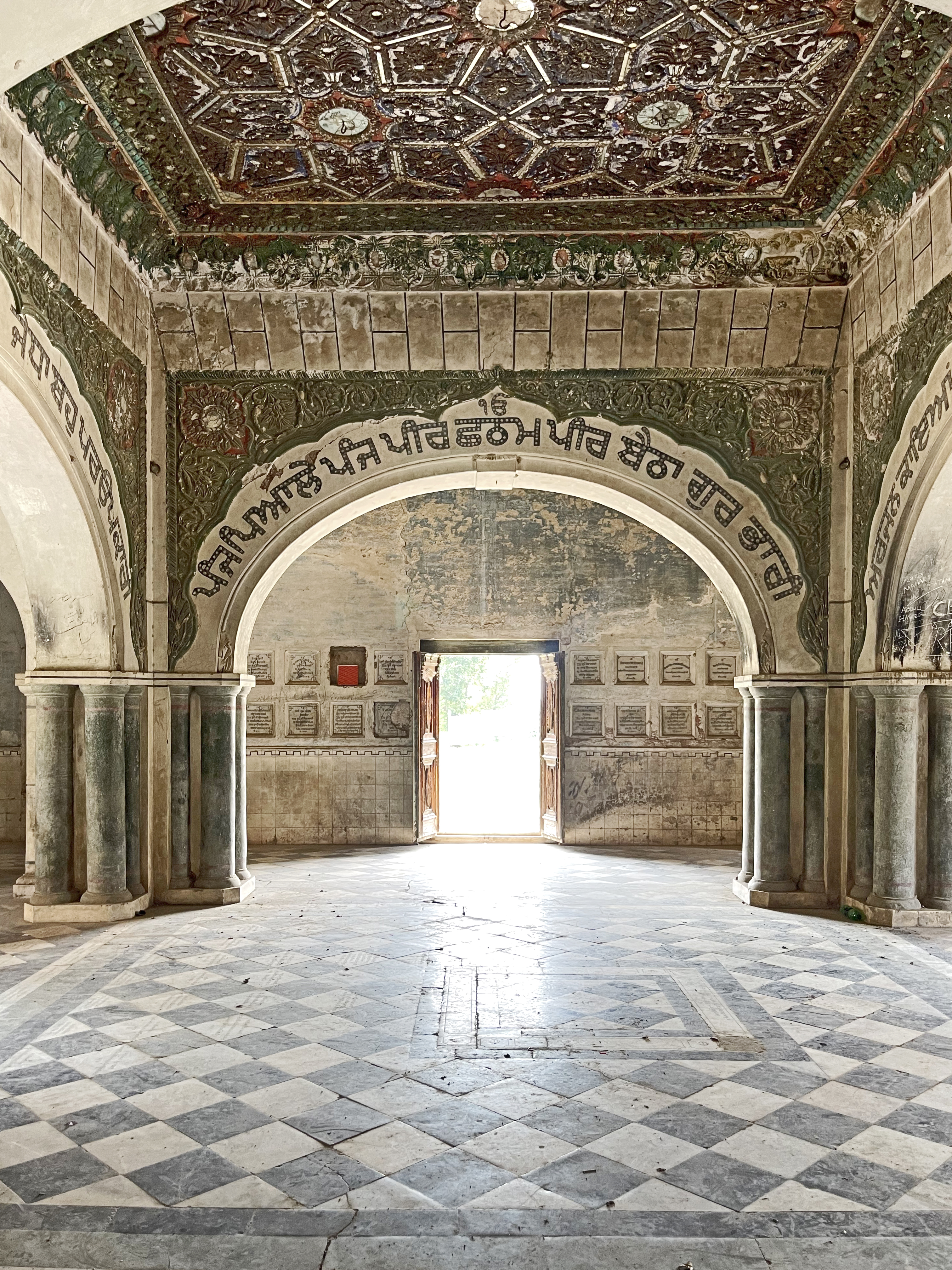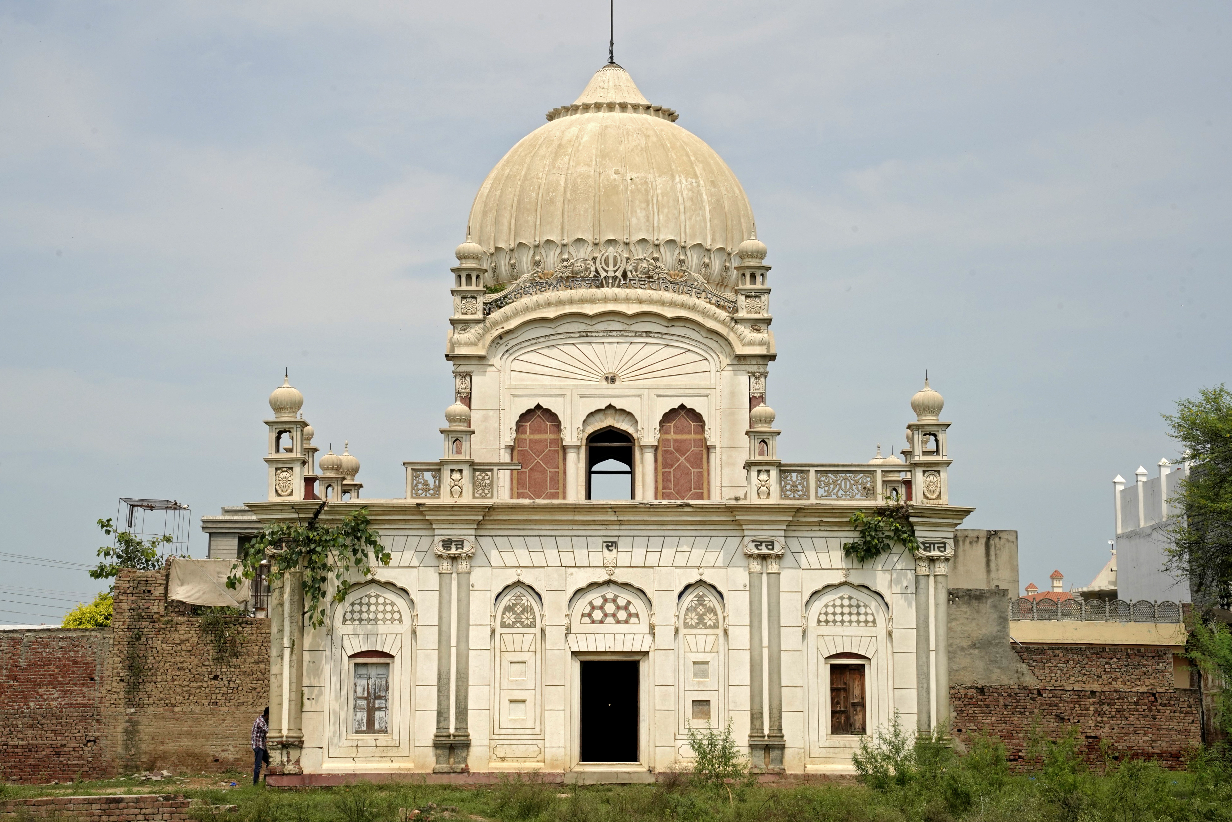 Religious hymns are inscribed on the four arches within the parikarma, accompanied by wooden ceilings with mirrored details at key points. The sukhasan, constructed from Nanakshahi brick with lime mortar, features lime-plastered exteriors ideal for fresco work. The entrance's multifoil arch retains faint frescoes depicting stories from Guru Nanak's life, despite significant weathering and vandalism.