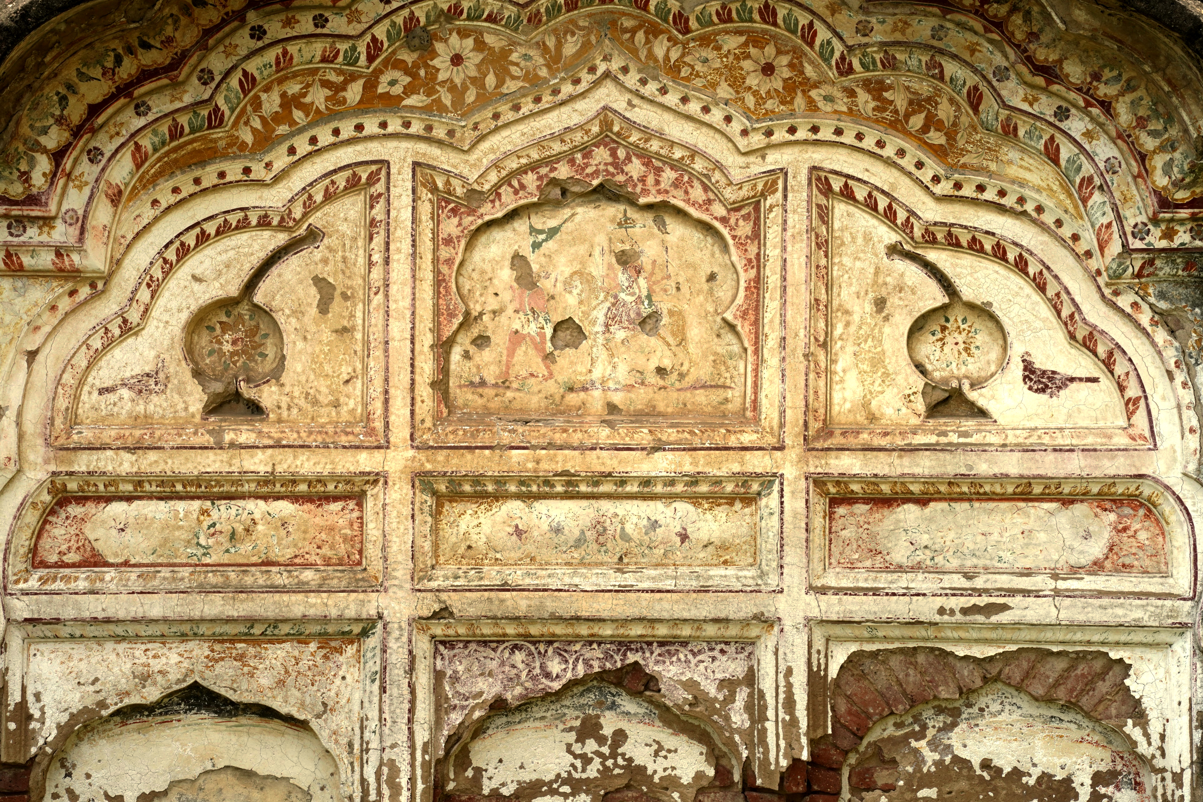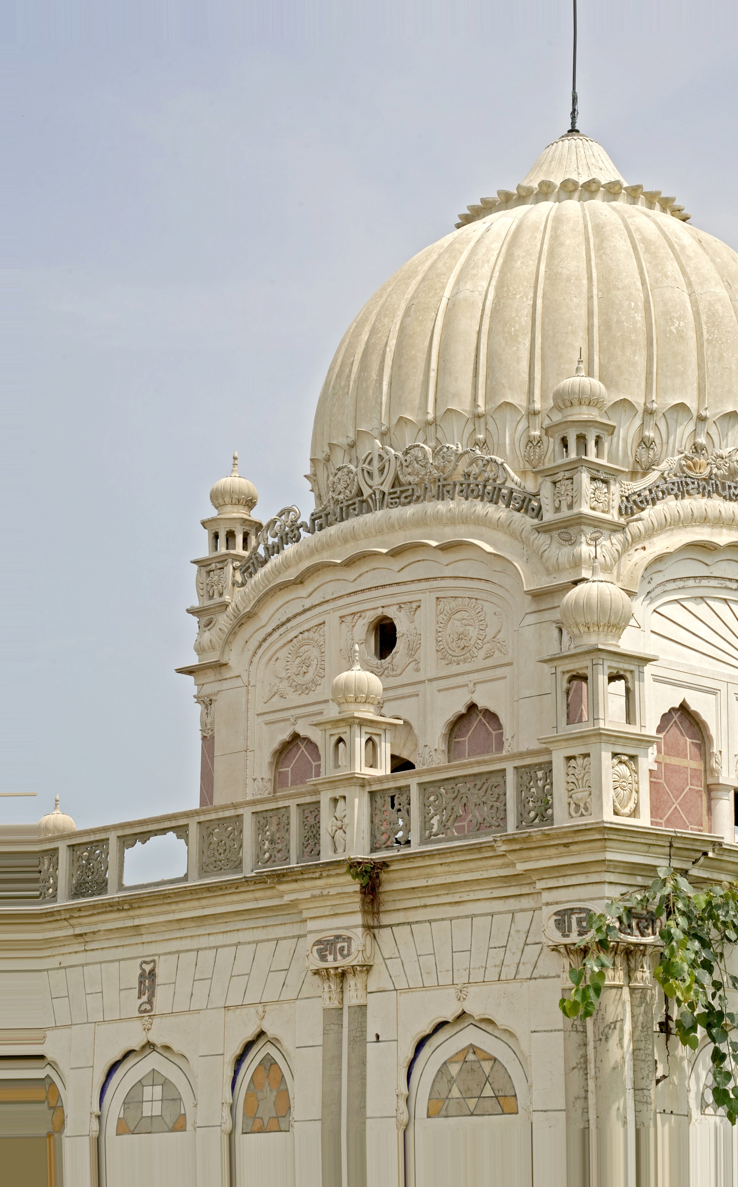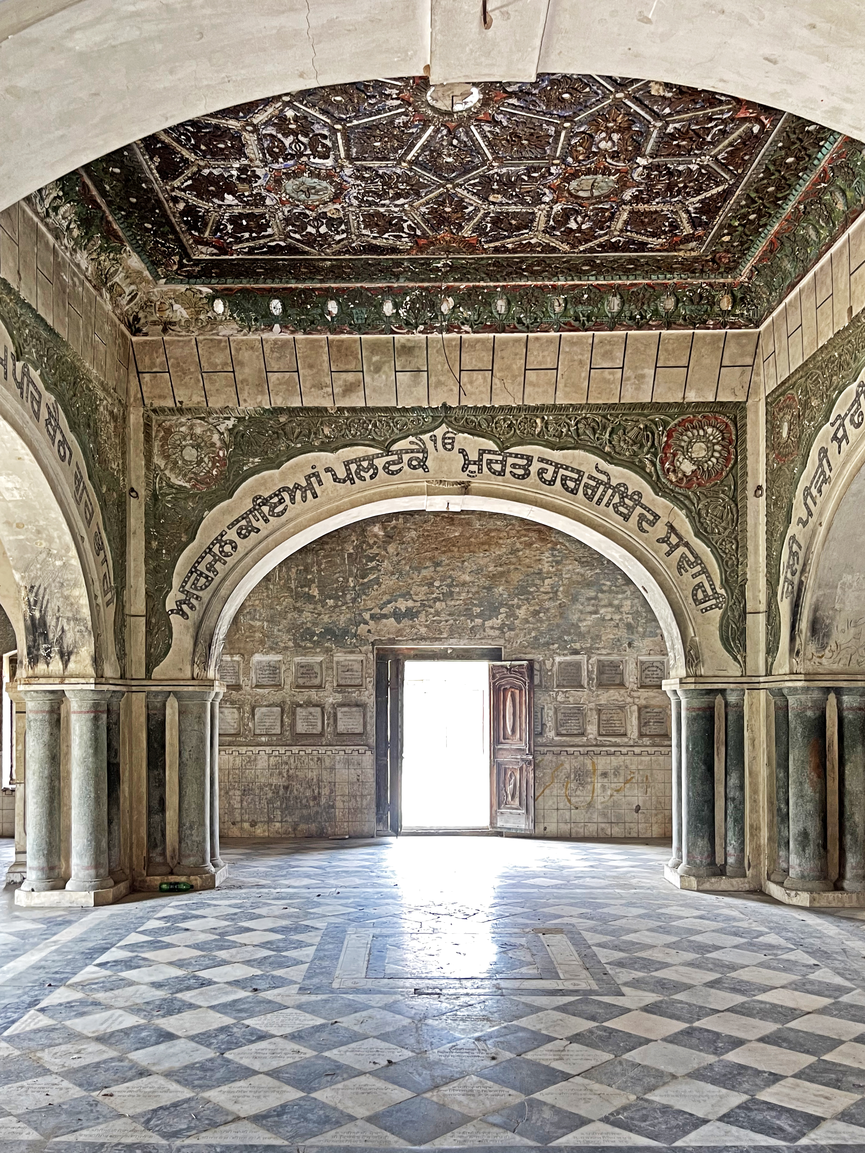 Religious hymns are inscribed on the four arches within the parikarma, accompanied by wooden ceilings with mirrored details at key points. The sukhasan, constructed from Nanakshahi brick with lime mortar, features lime-plastered exteriors ideal for fresco work. The entrance's multifoil arch retains faint frescoes depicting stories from Guru Nanak's life, despite significant weathering and vandalism.