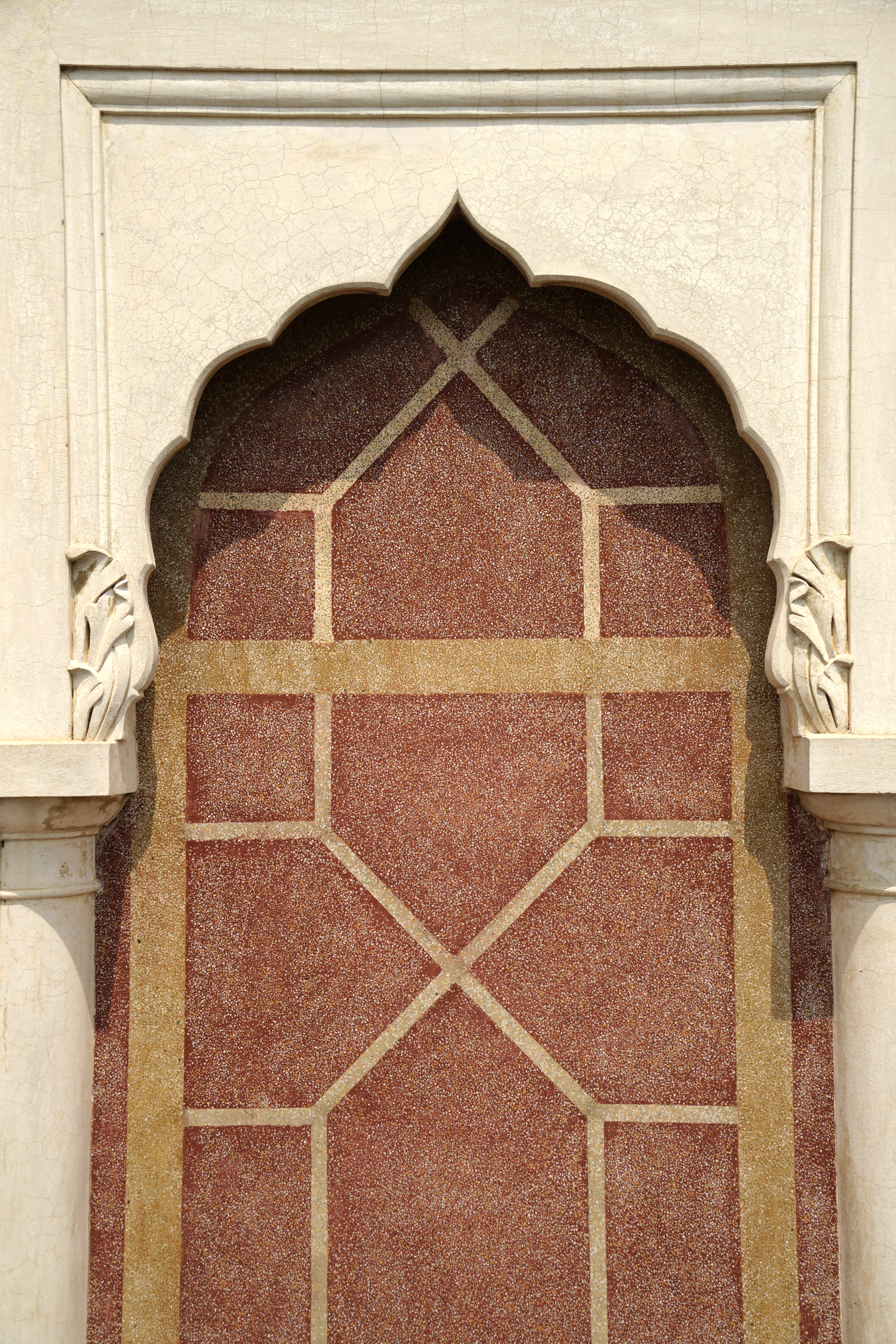 The first-floor arches and pilasters are adorned with red terrazzo outlined by yellow terrazzo bands, adding vibrancy to the otherwise subdued palette.