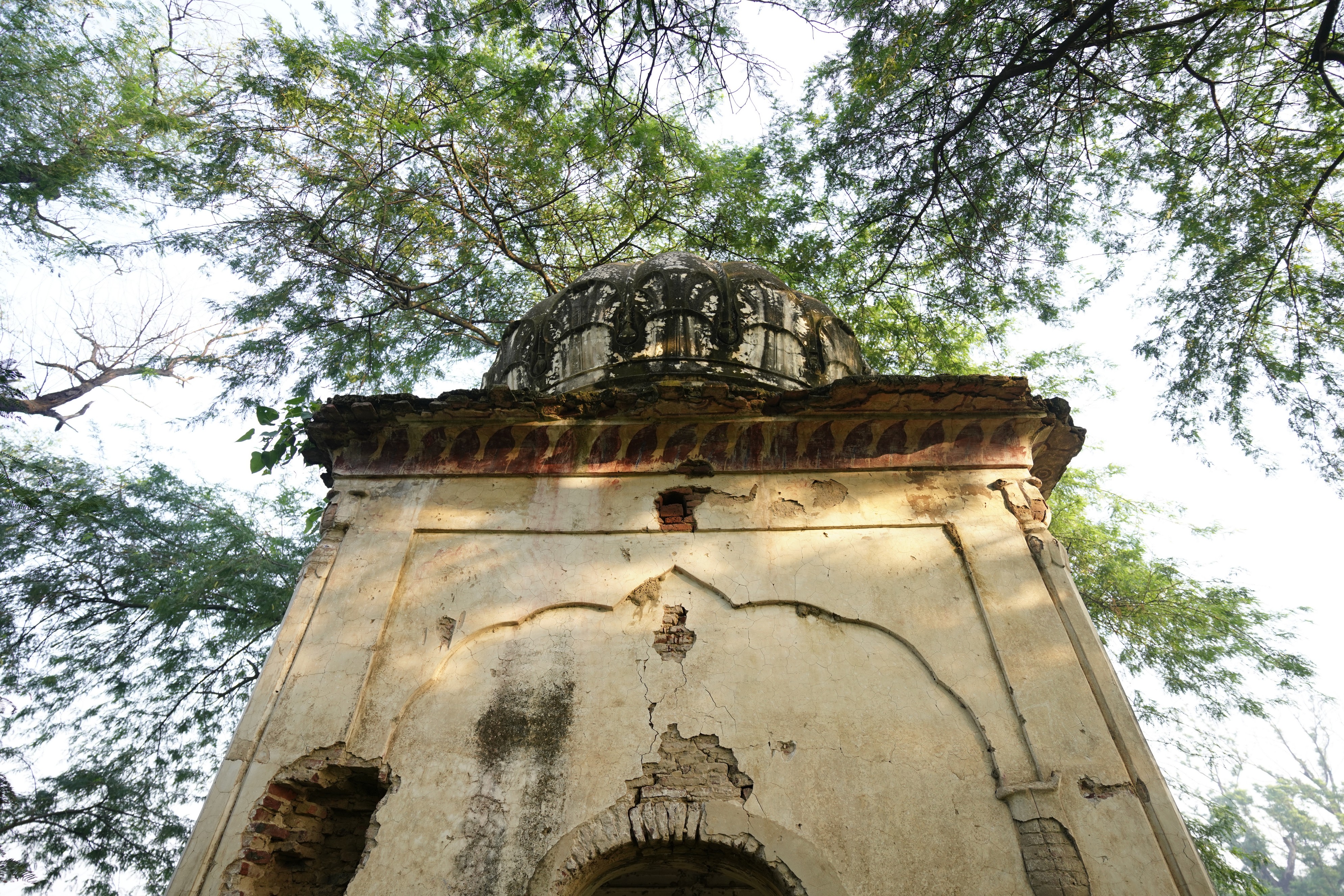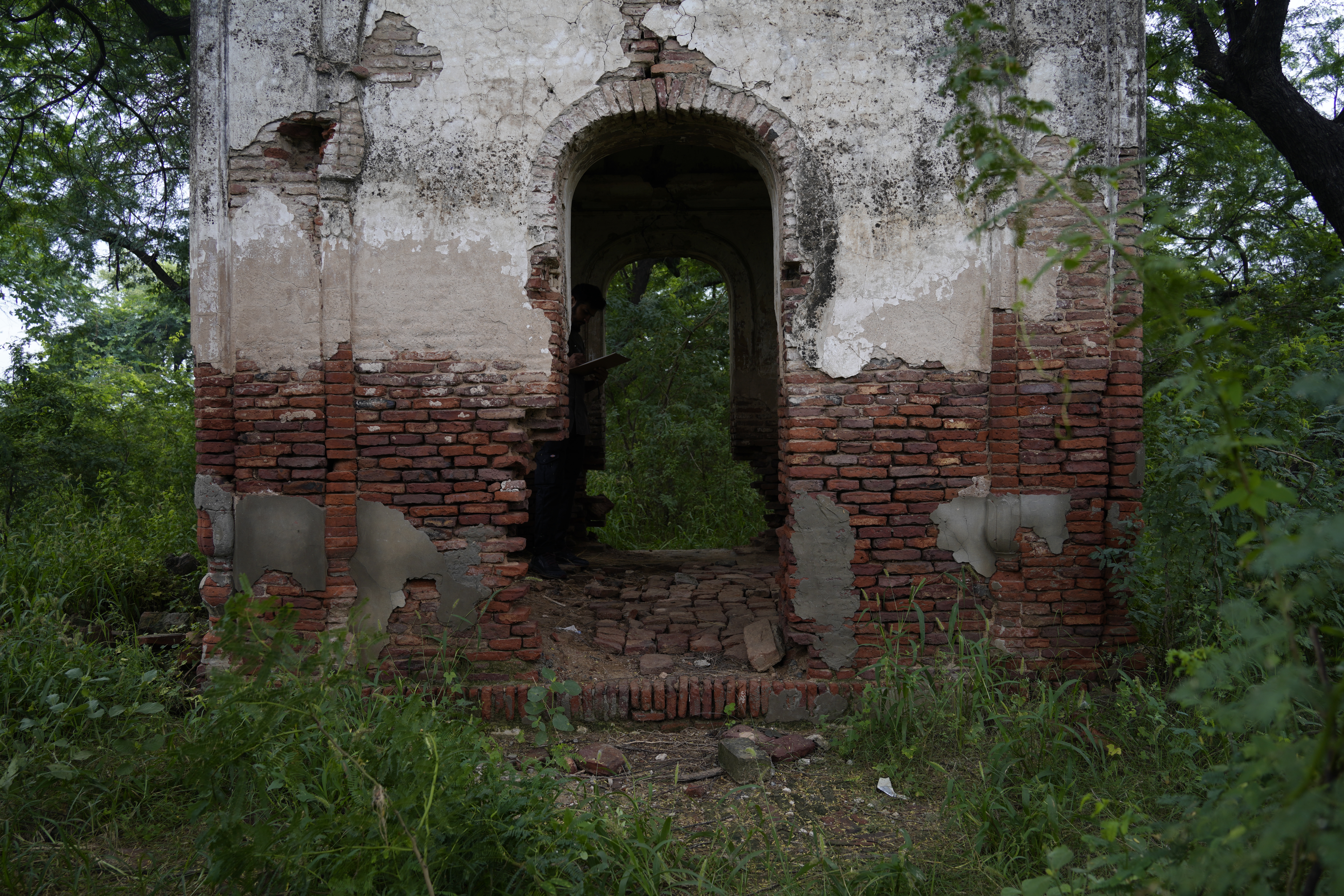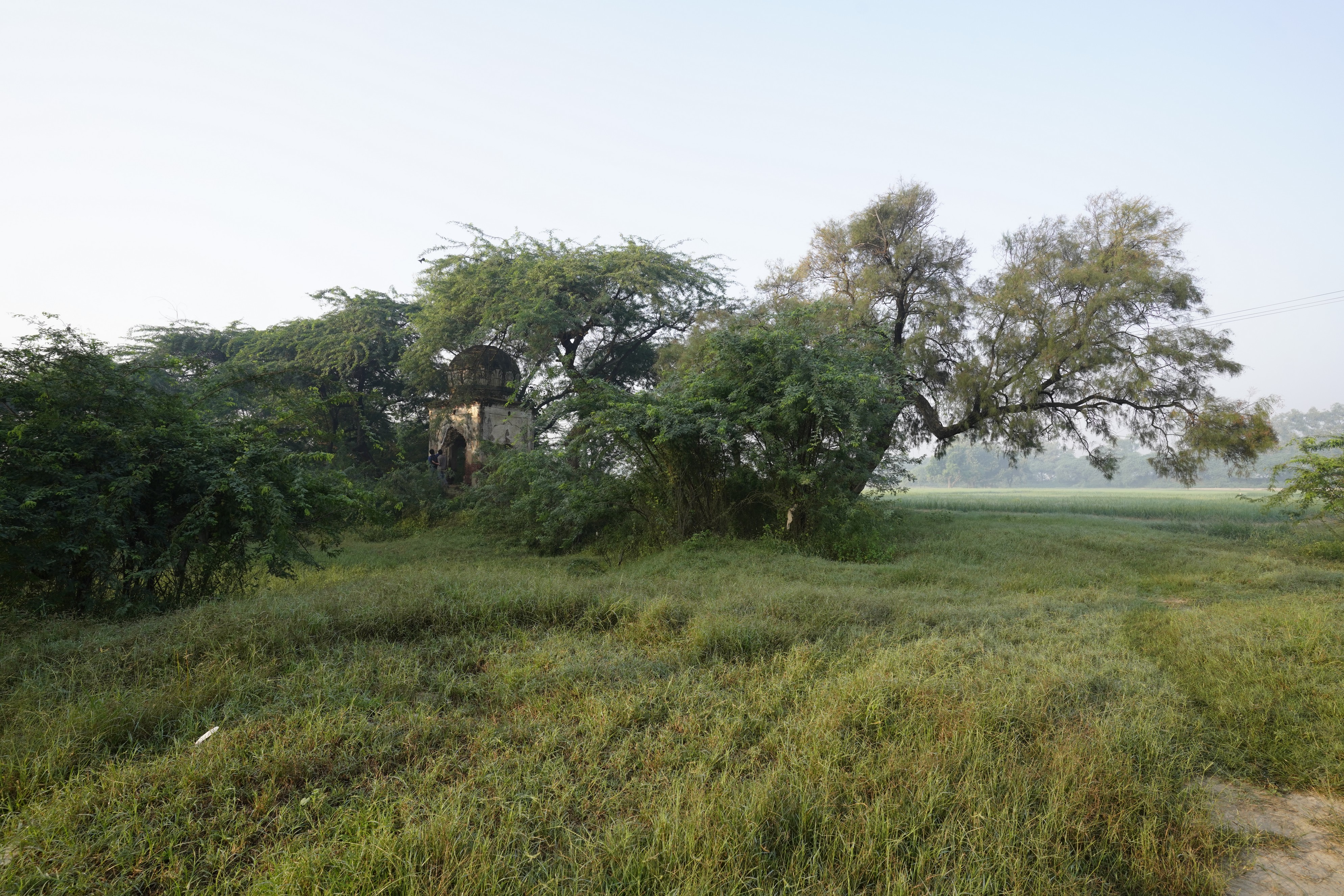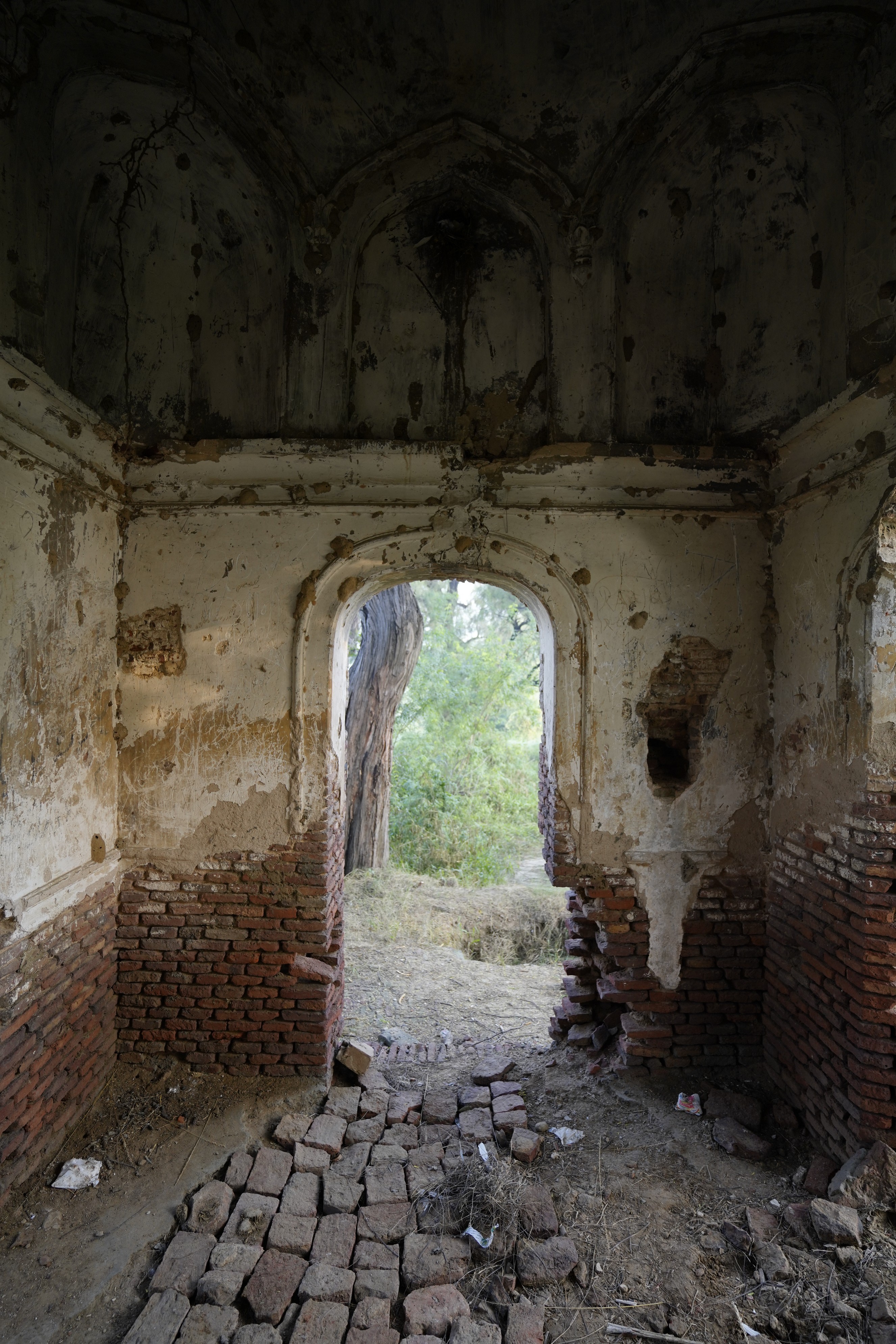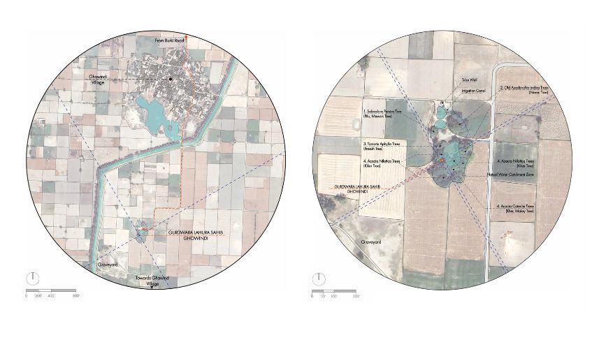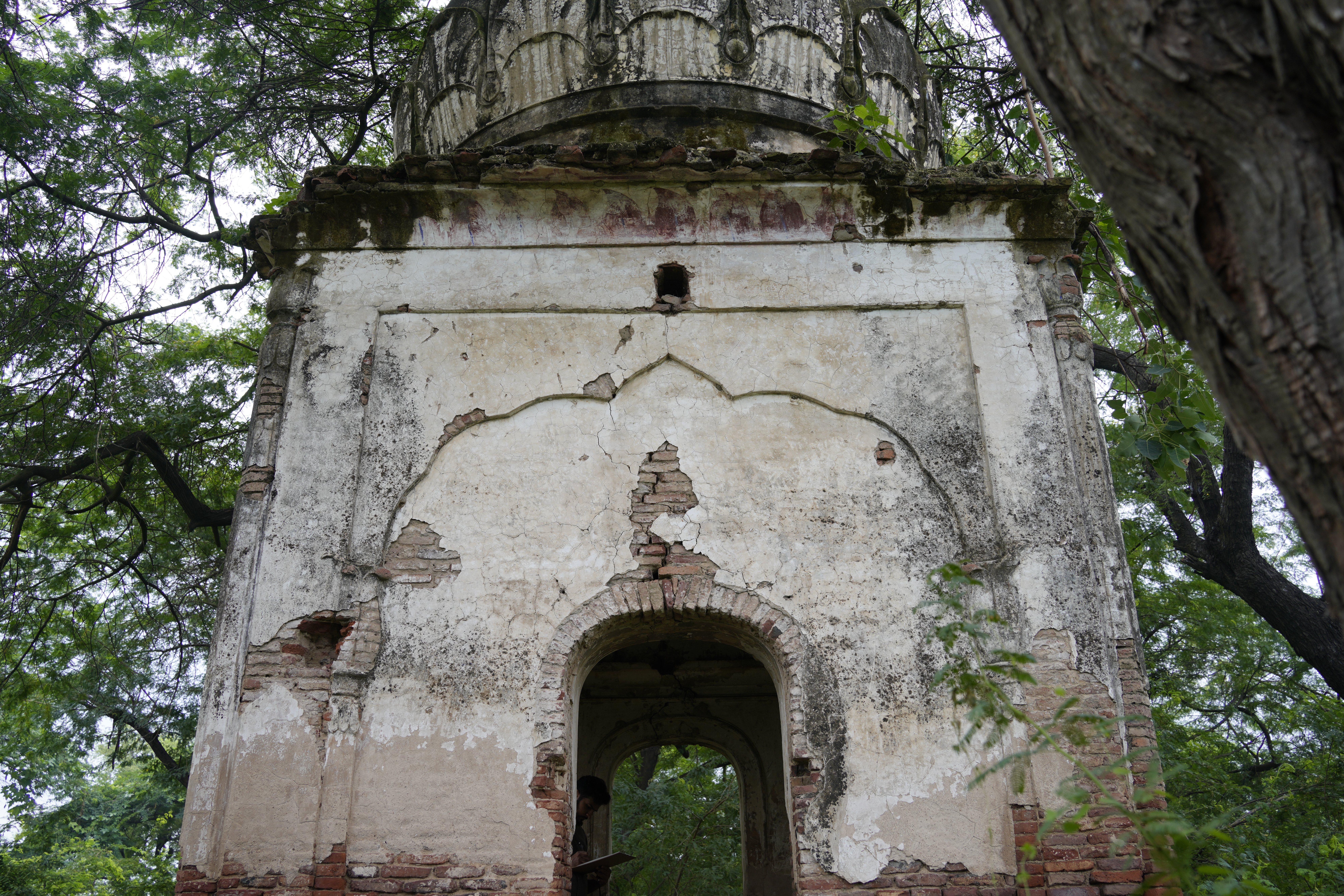 Waliullah Khan, in his book Sikh Shrines in West Pakistan (1962), has documented a photograph of a large entrance gate to the gurdwara at Ghowindi." However, no such structure can be found today in the village. There remains an eroded, small, square structure on the outskirts of Ghowindi, which the locals describe used to be a gurdwara once. It is made of exposed brick and is topped with a dome. The sarovar and a well have dried up. Surrounding the ruins are numerous trees, including a tall, bushy Lahura tree, whose lush and leafy branches hang low, almost touching the ground.