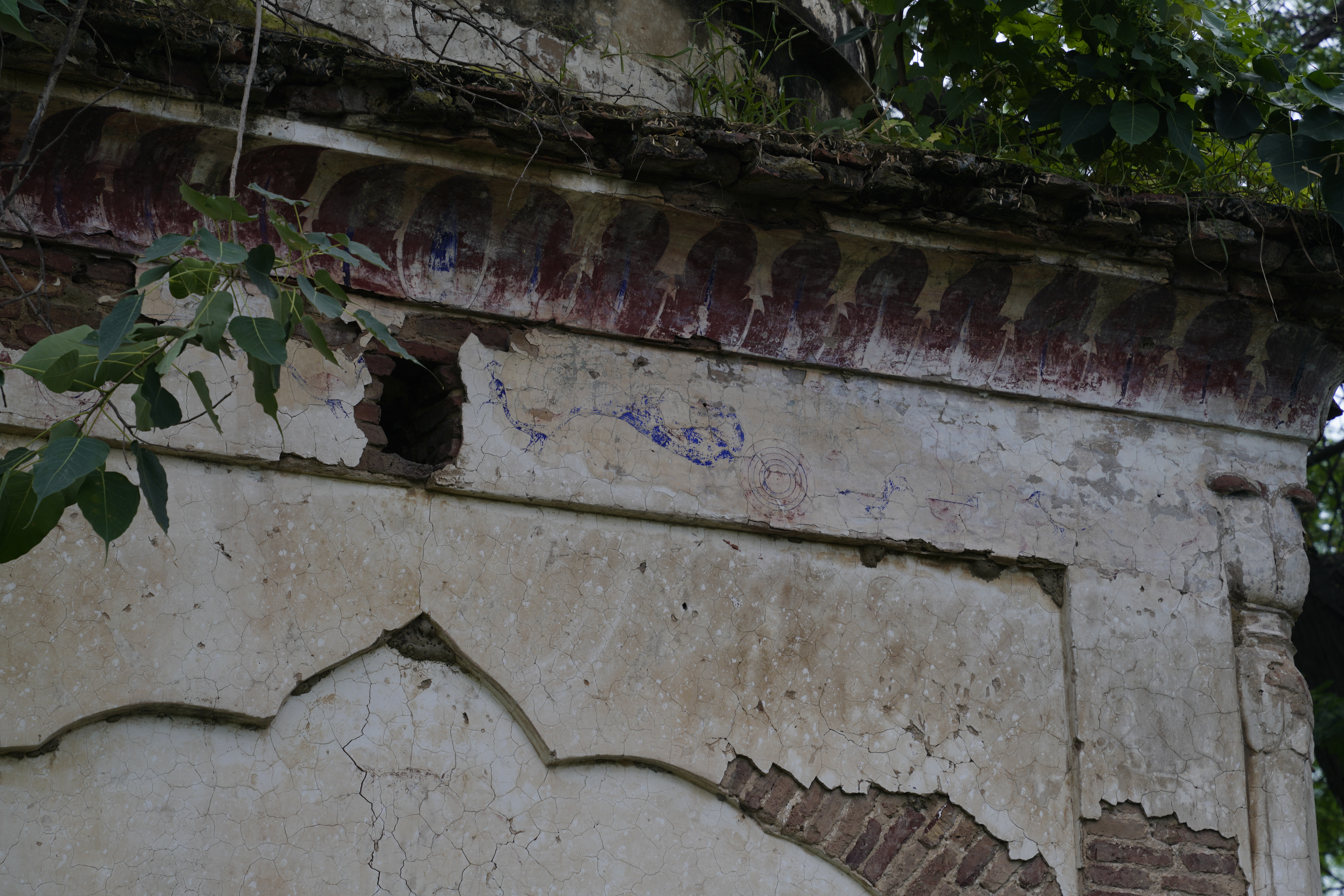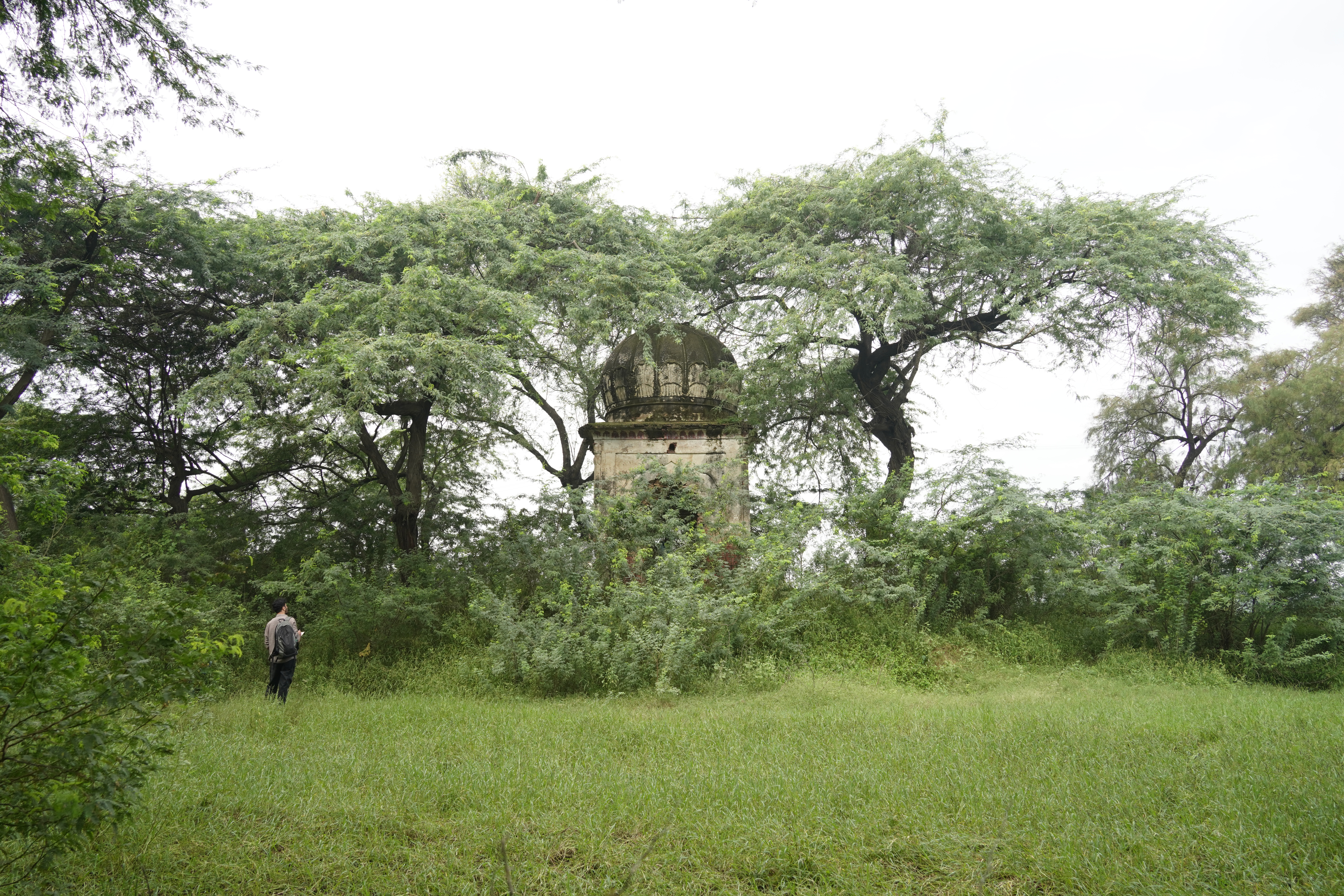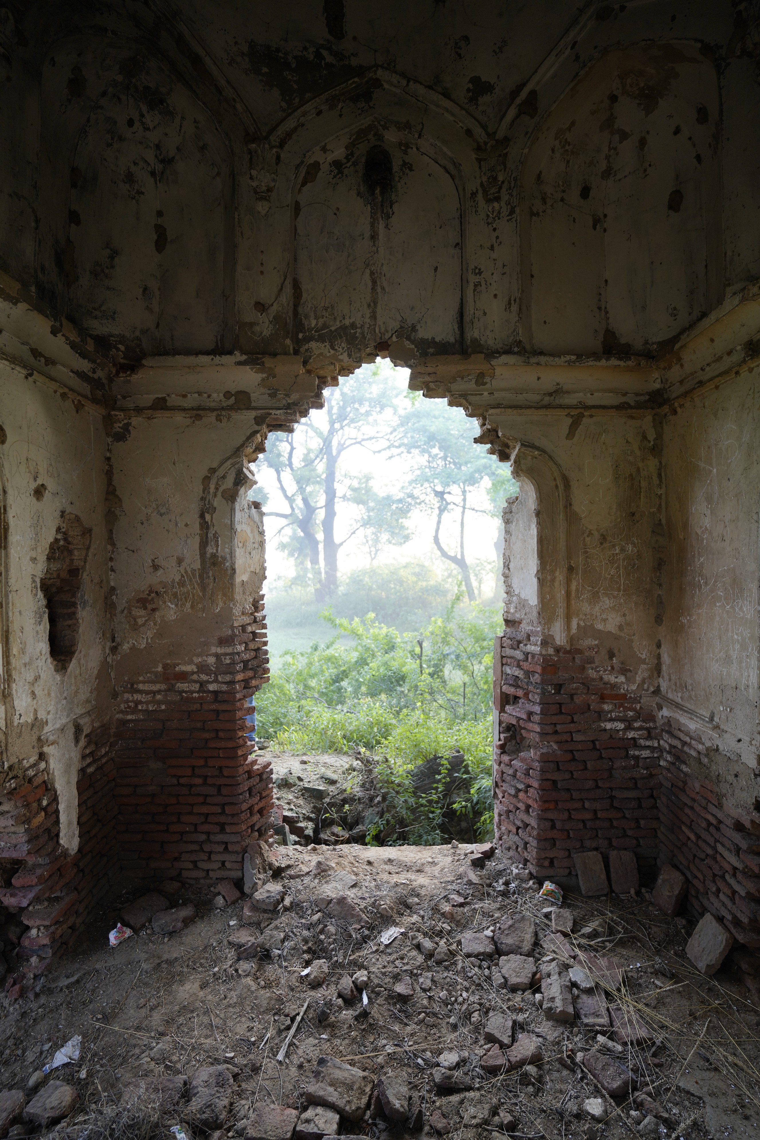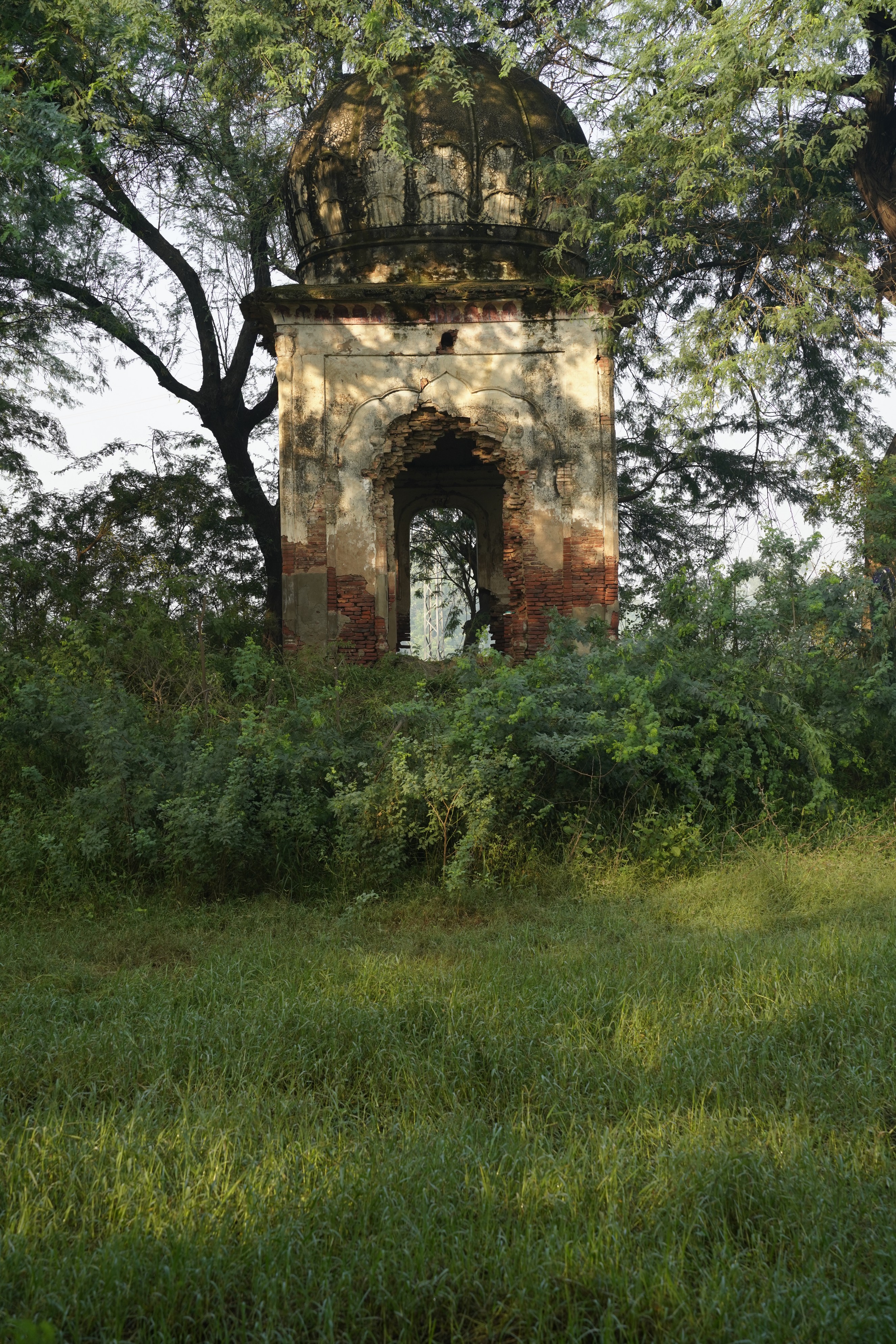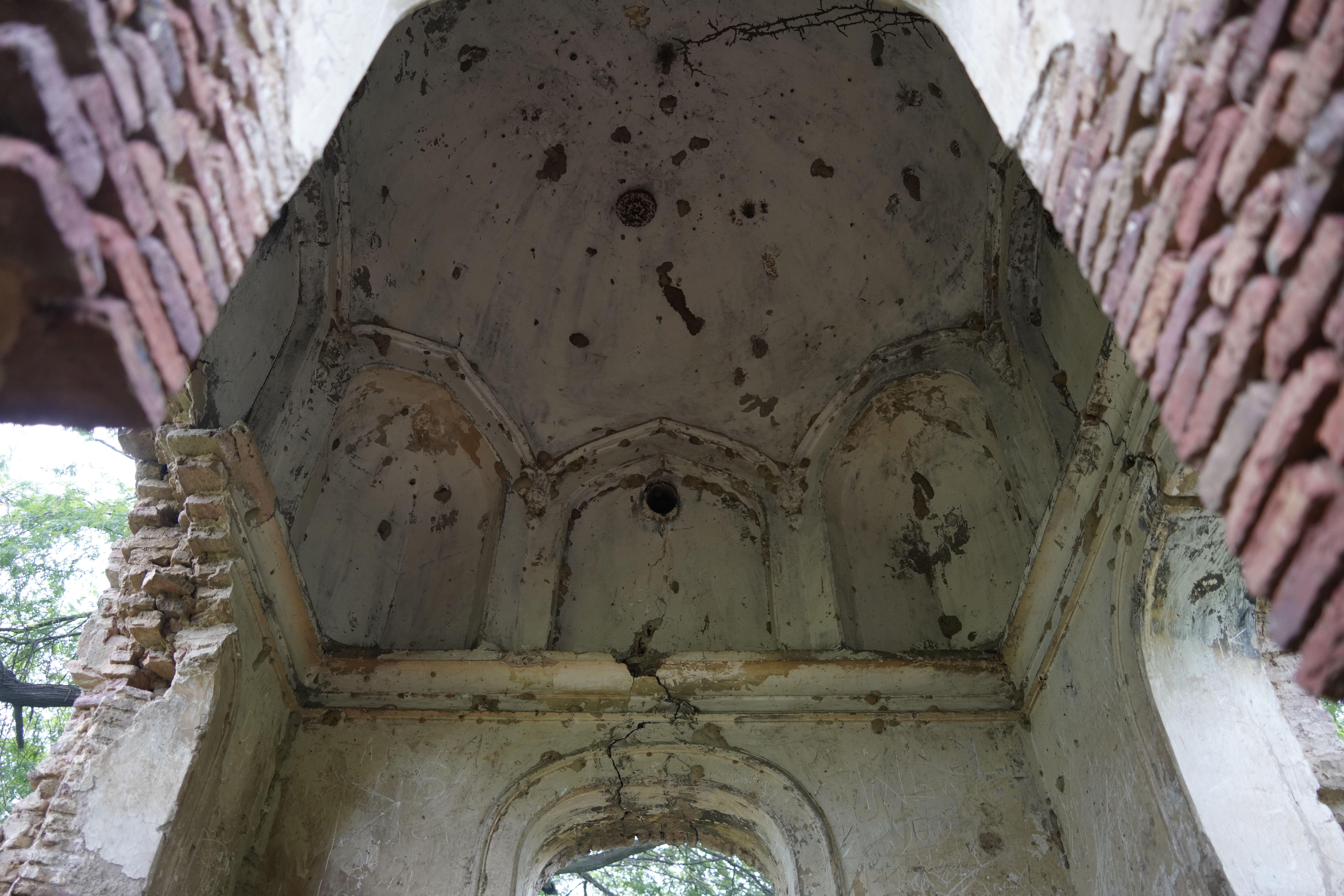 Waliullah Khan, in his book Sikh Shrines in West Pakistan (1962), has documented a photograph of a large entrance gate to the gurdwara at Ghowindi." However, no such structure can be found today in the village. There remains an eroded, small, square structure on the outskirts of Ghowindi, which the locals describe used to be a gurdwara once. It is made of exposed brick and is topped with a dome. The sarovar and a well have dried up. Surrounding the ruins are numerous trees, including a tall, bushy Lahura tree, whose lush and leafy branches hang low, almost touching the ground.