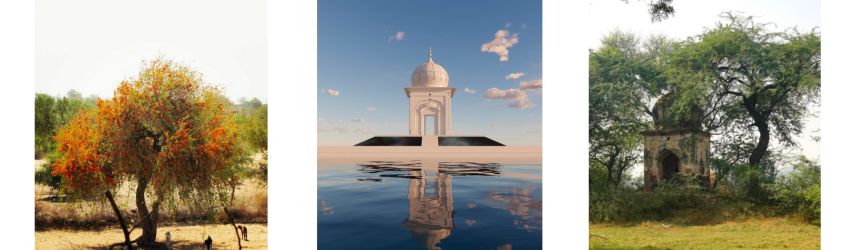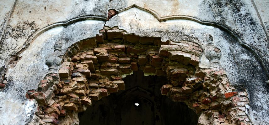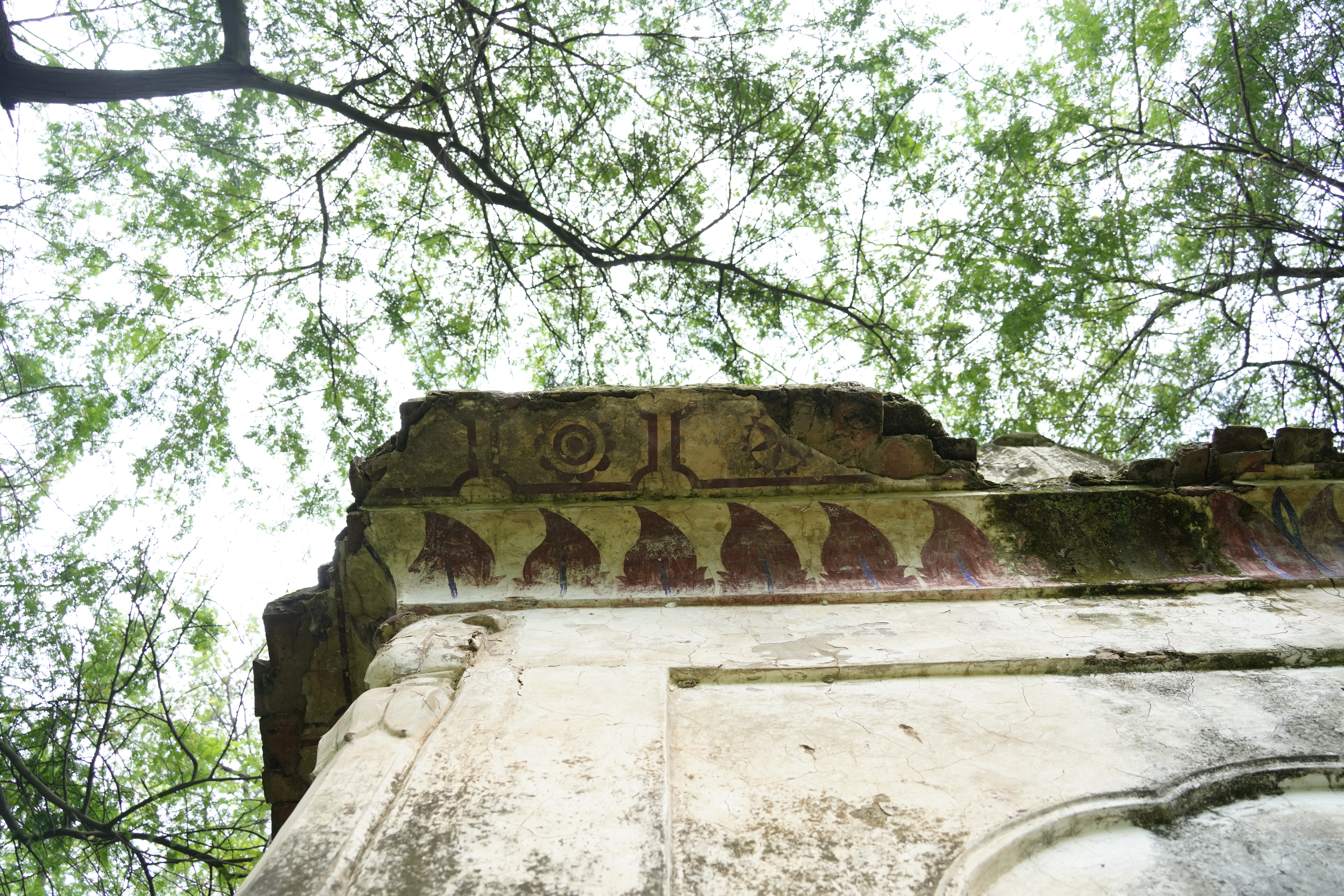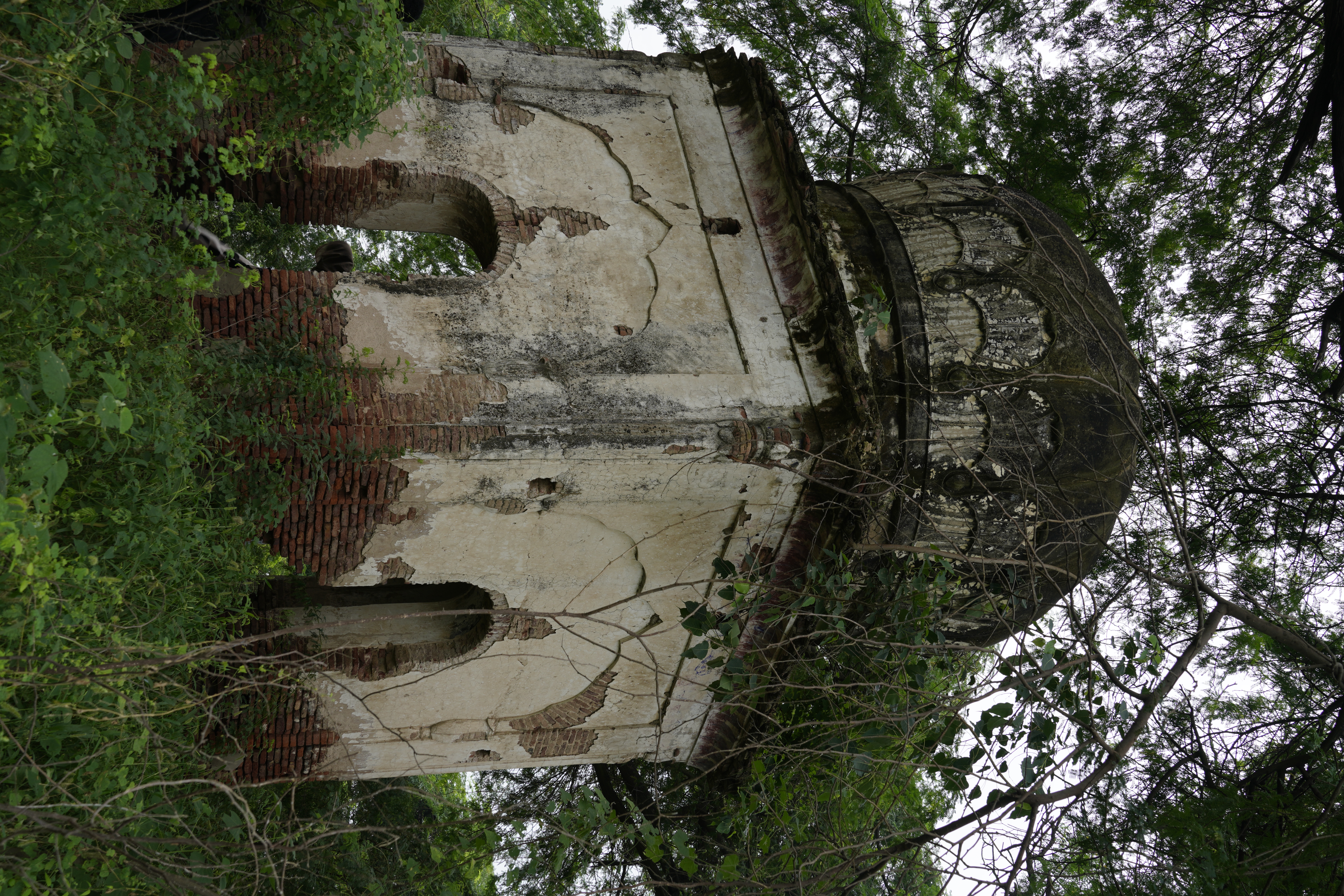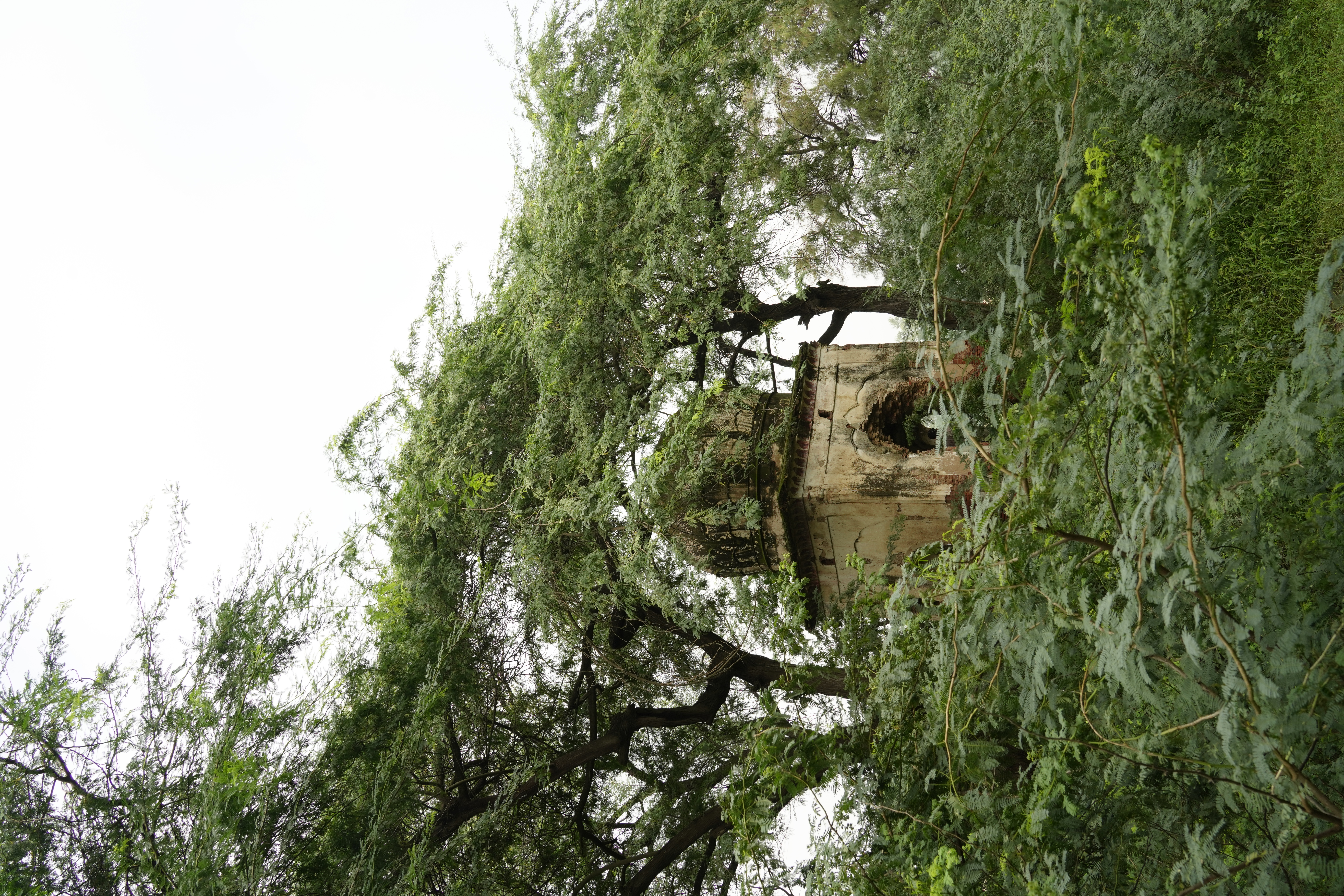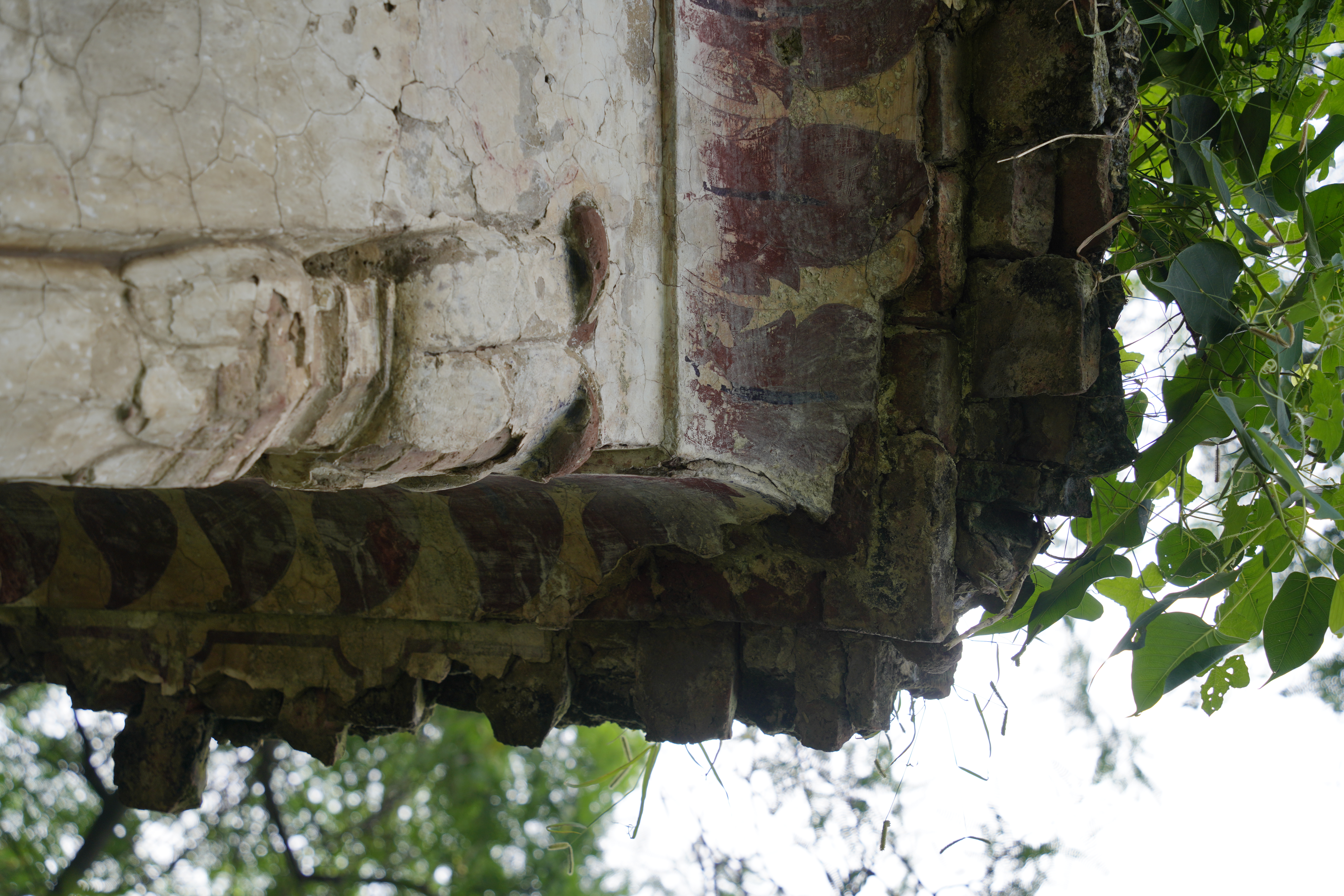 Waliullah Khan, in his book Sikh Shrines in West Pakistan (1962), has documented a photograph of a large entrance gate to the gurdwara at Ghowindi." However, no such structure can be found today in the village. There remains an eroded, small, square structure on the outskirts of Ghowindi, which the locals describe used to be a gurdwara once. It is made of exposed brick and is topped with a dome. The sarovar and a well have dried up. Surrounding the ruins are numerous trees, including a tall, bushy Lahura tree, whose lush and leafy branches hang low, almost touching the ground.