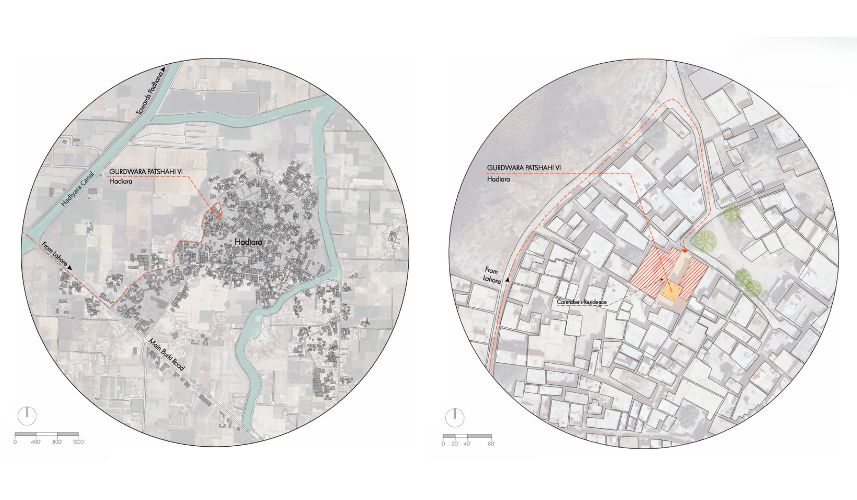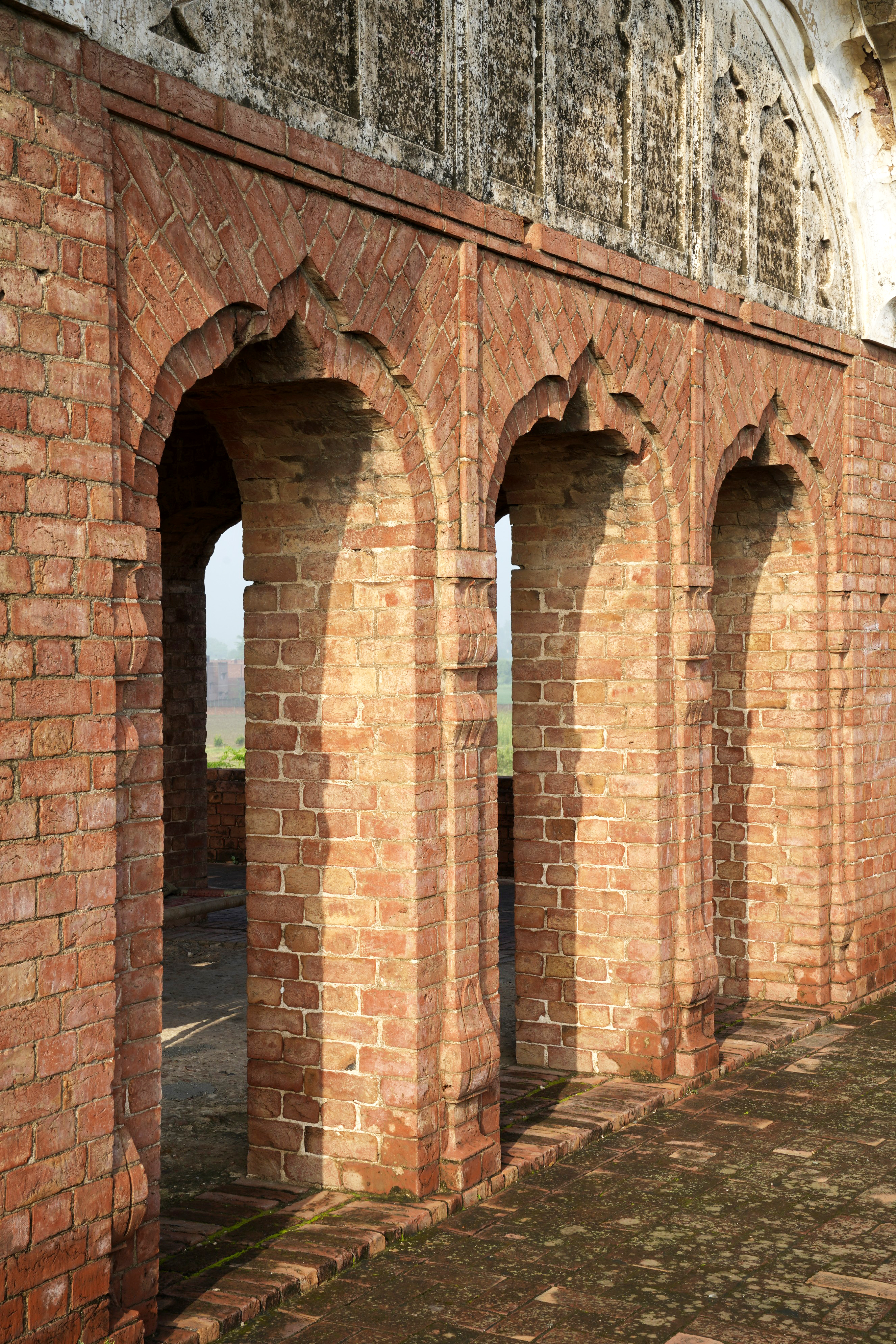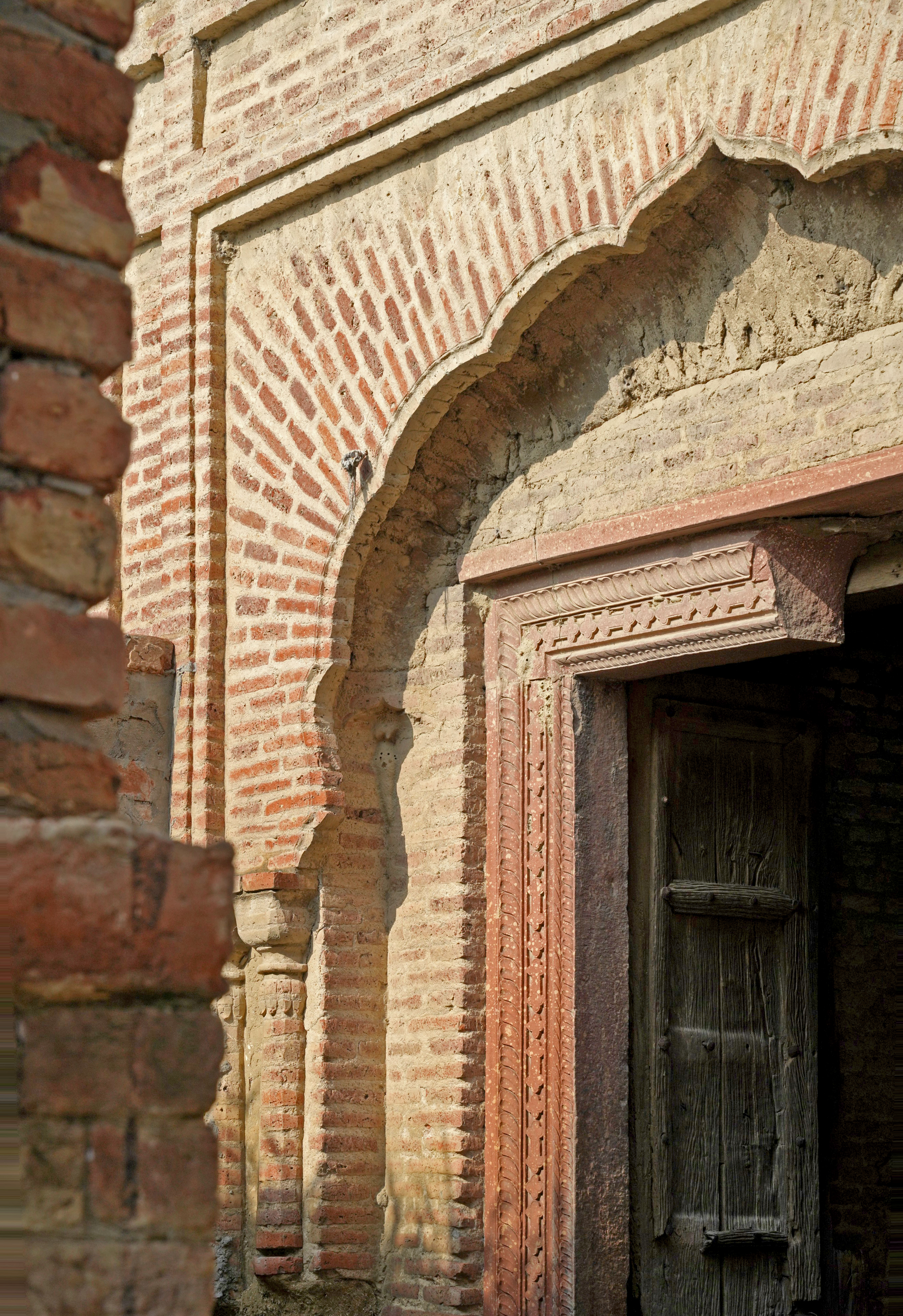 Gurdwara Patshahi Chevin in Padhana reflects an evolving architectural narrative that combines traditional Sikh design elements with later stylistic developments. The structure, constructed in two distinct stages, showcases a blend of Nanakshahi and colonial influences. The ground floor, attributed to an earlier phase, is built using Nanakshahi bricks, while the upper story and dome, added in 1940, employ standard- sized bricks (9x4.5x3 inches). This variation in materials serves as a tangible marker of its phased construction, with the architectural style transitioning from simple round arches on the ground floor to more complex ellipsoid and multi-foiled arches on the upper levels. This evolution reflects a growing sensibility in Sikh architectural aesthetics during the period.