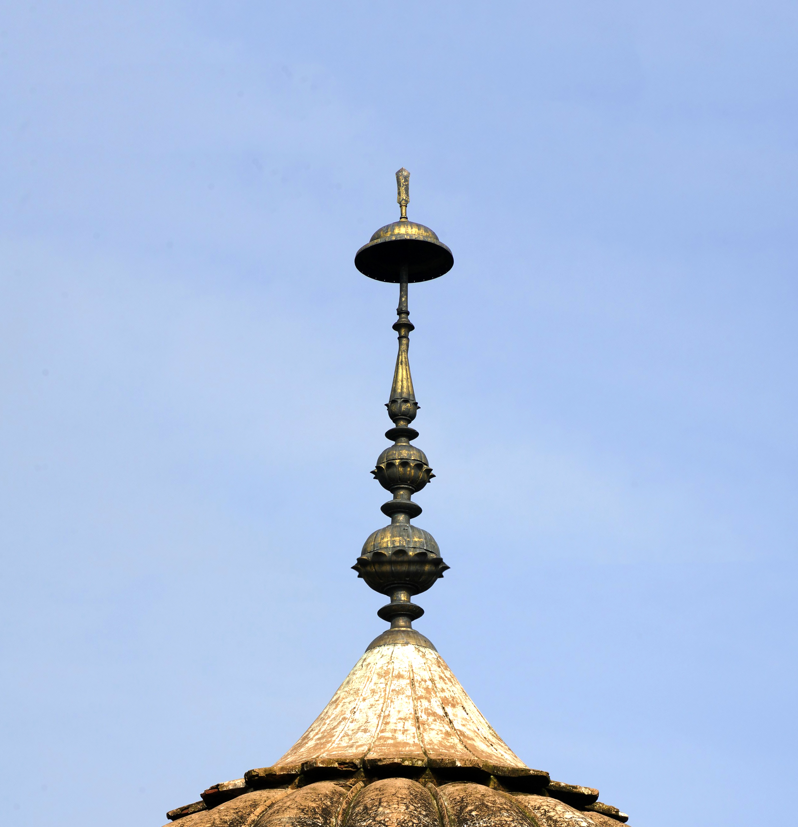 At the heart of the Gurdwara lies a double-height central chamber, which underscores verticality and grandeur. This chamber features intricate stucco work on its ceiling, adorned with motifs that closely resemble those found in the nearby Jawala Singh Haveli, linking the Gurdwara’s design to local artistic traditions. The dome, crowning the structure, is a defining feature. Adorned with a metal kalash, it exudes grandeur, with its scale and craftsmanship symbolizing the spiritual aspirations of the Sikh faith. The dome’s load is ingeniously transferred to the square base through corbelled pendentives supported by three-centered depressed arches, ensuring both stability and aesthetic elegance. The skyline is further enhanced by four domical turrets (gumtiyan) at the roof's corners, a characteristic feature of Sikh shrines.