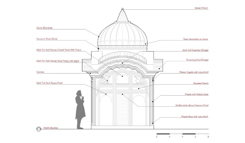 The Gurdwara's architectural elegance is reflected in its intricate details, as illustrated in the attached sectional drawings and elevations. The structure comprises British brick (measuring 3"x4.5"x9") with a cement plaster finish, originally in white, which remains vibrant even after decades. Influences of classical Greek architecture are evident in the Corinthian-style columns and cement-based decorative elements adorning the façade.