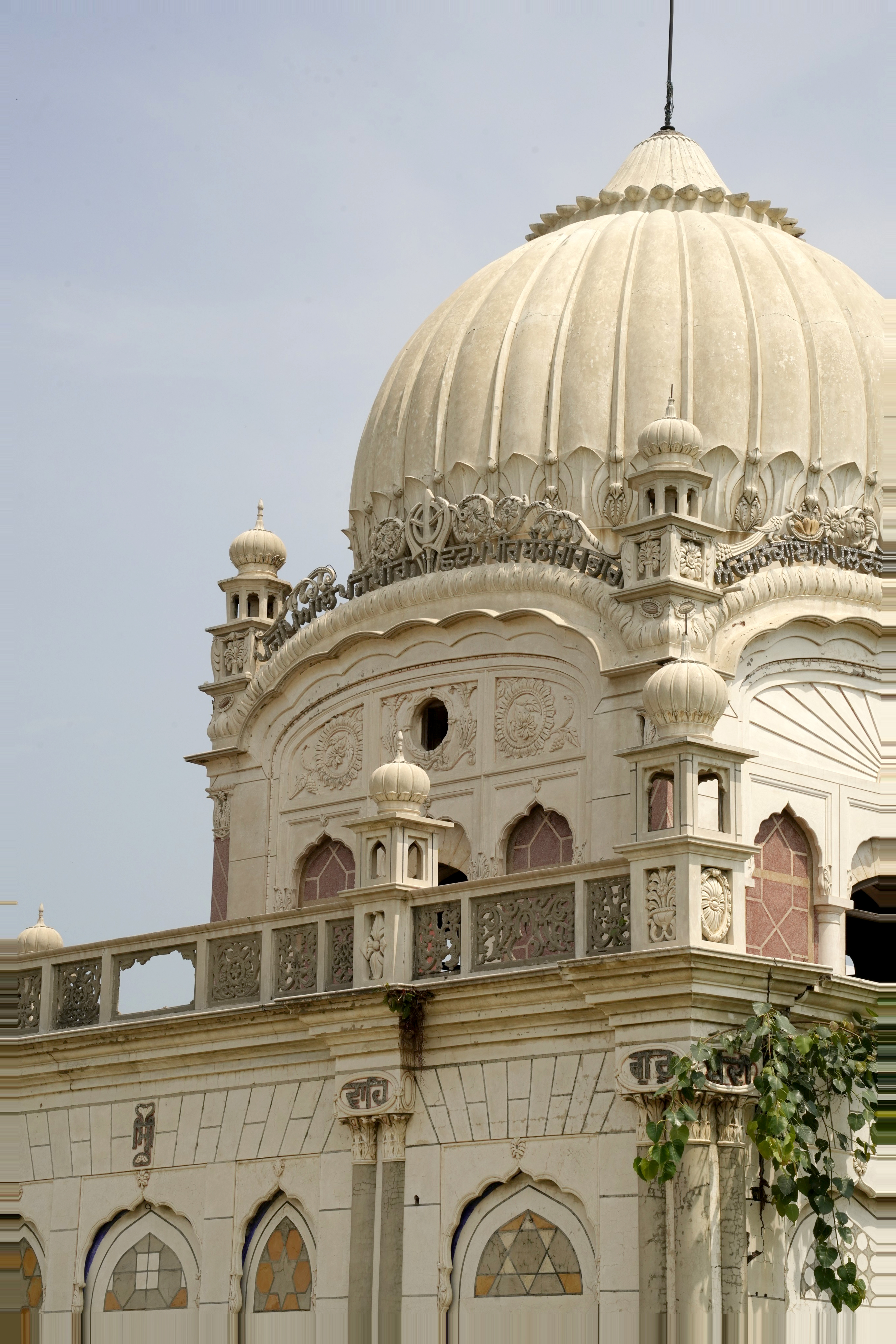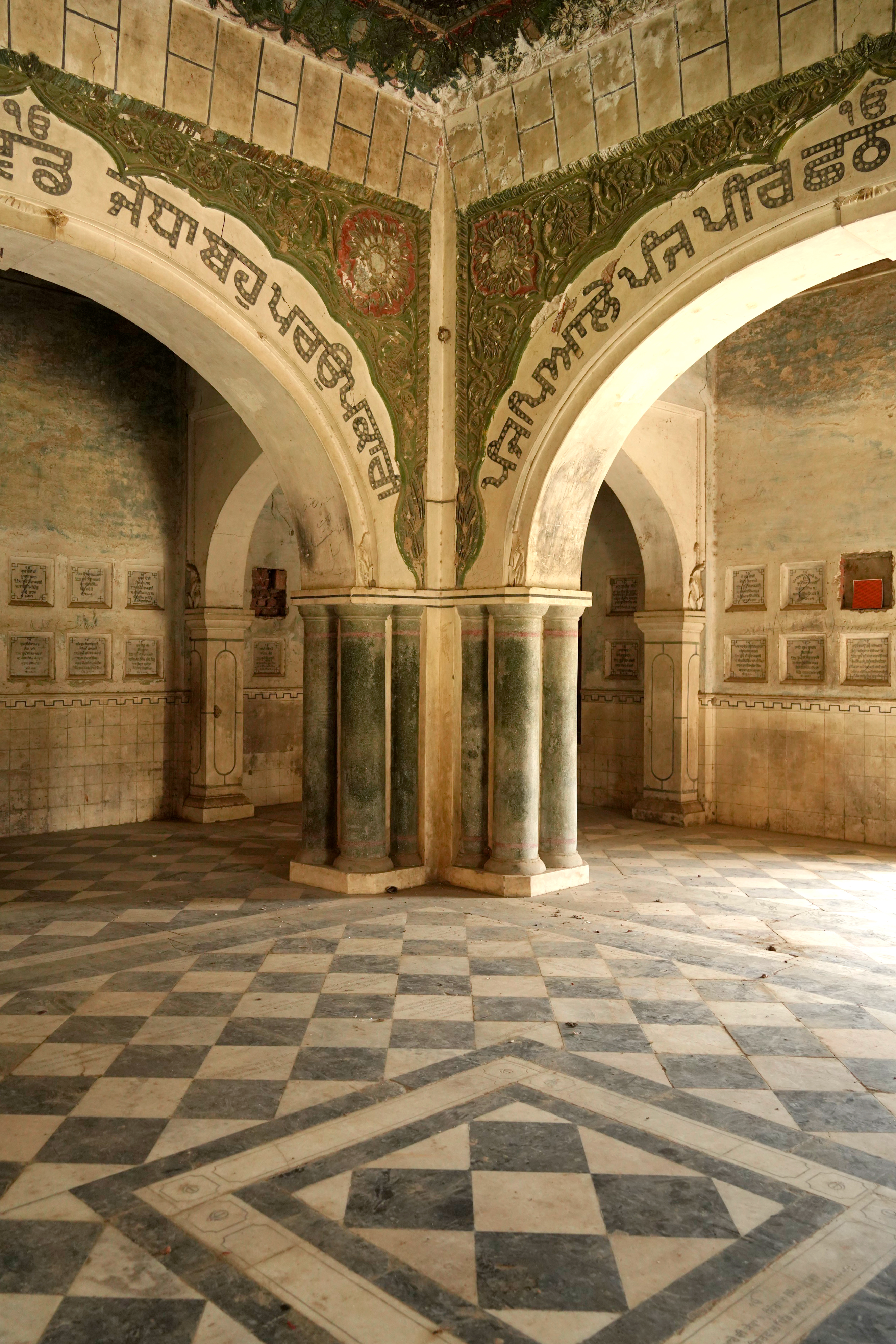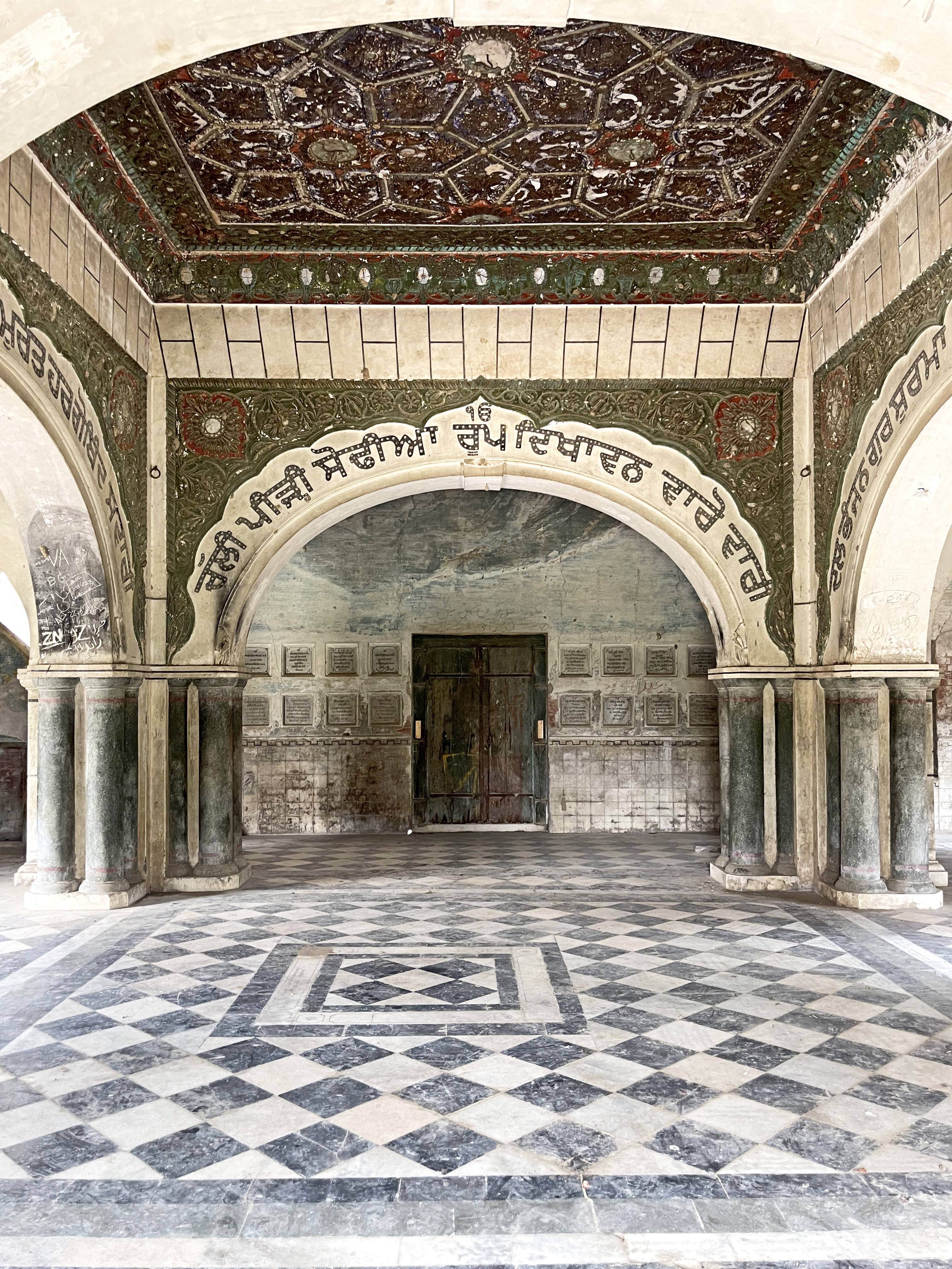 Religious hymns are inscribed on the four arches within the parikarma, accompanied by wooden ceilings with mirrored details at key points. The sukhasan, constructed from Nanakshahi brick with lime mortar, features lime-plastered exteriors ideal for fresco work. The entrance's multifoil arch retains faint frescoes depicting stories from Guru Nanak's life, despite significant weathering and vandalism.