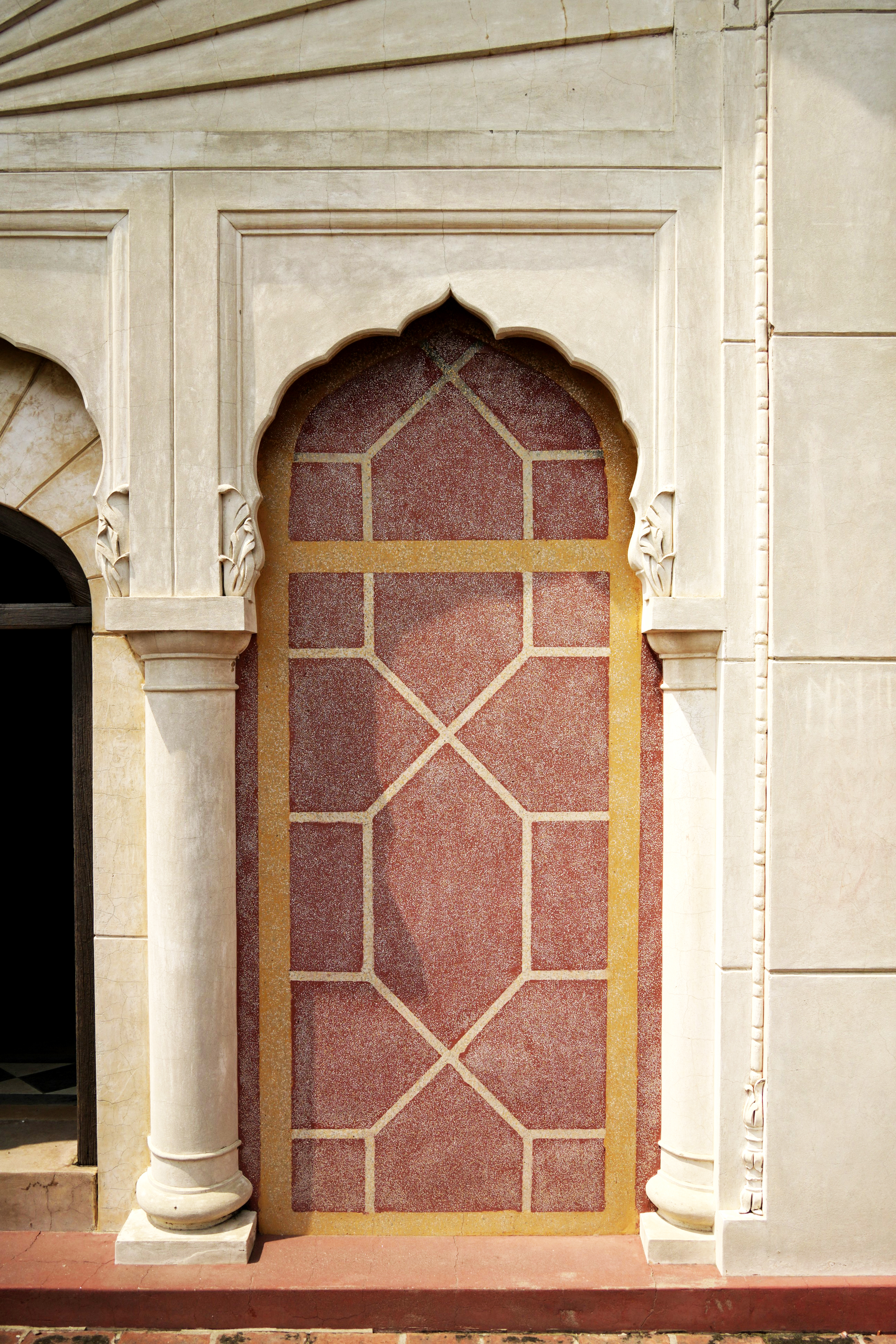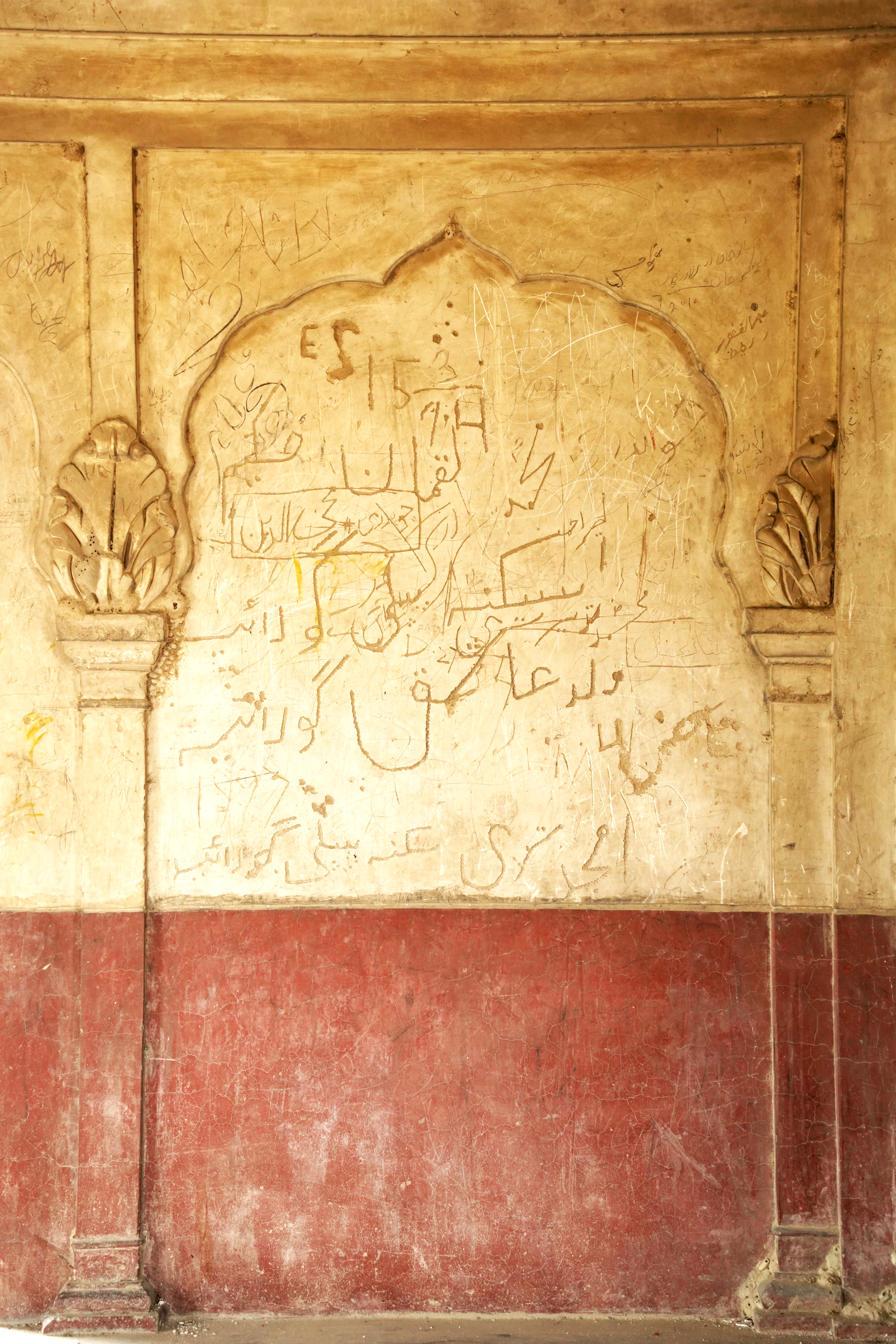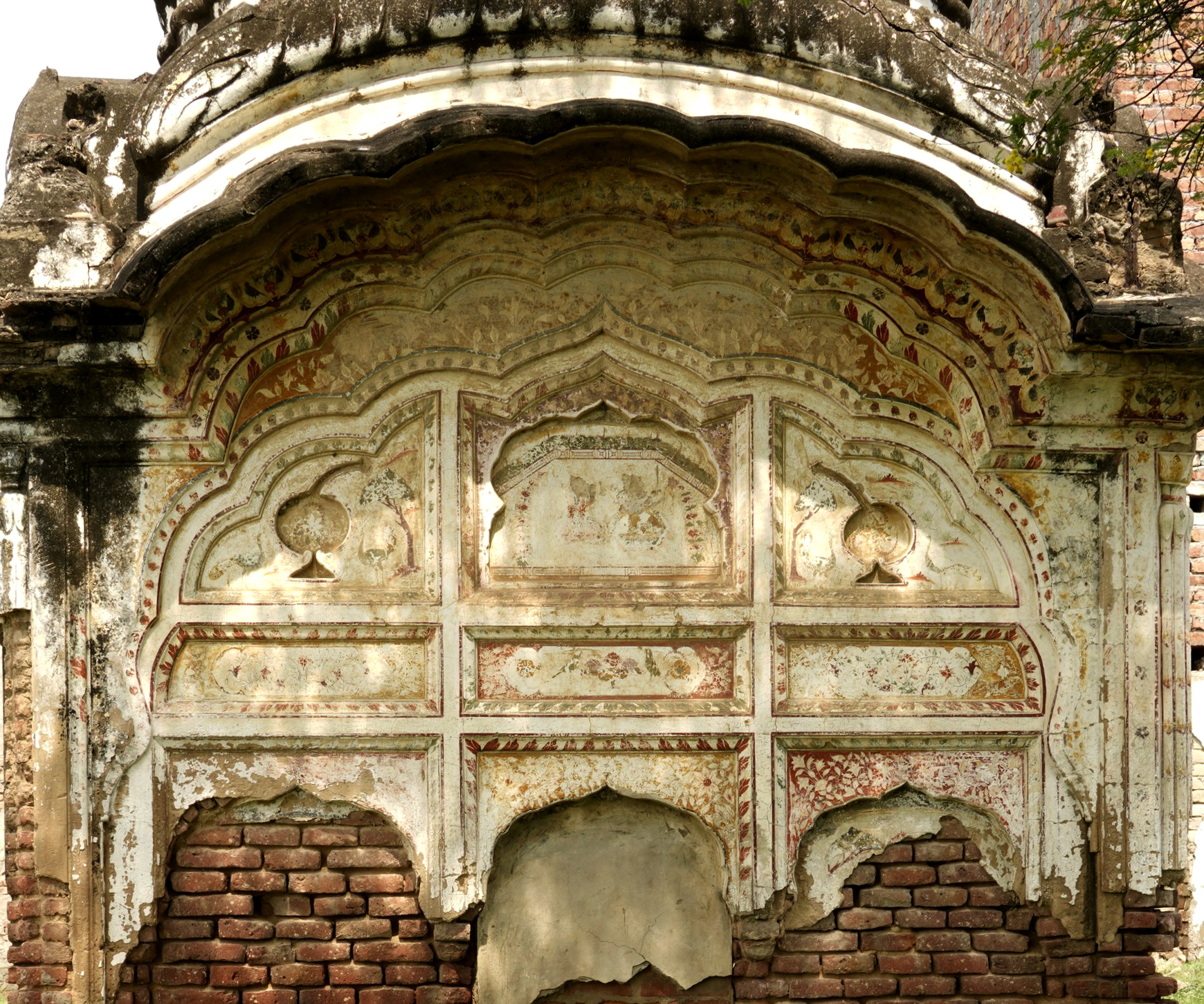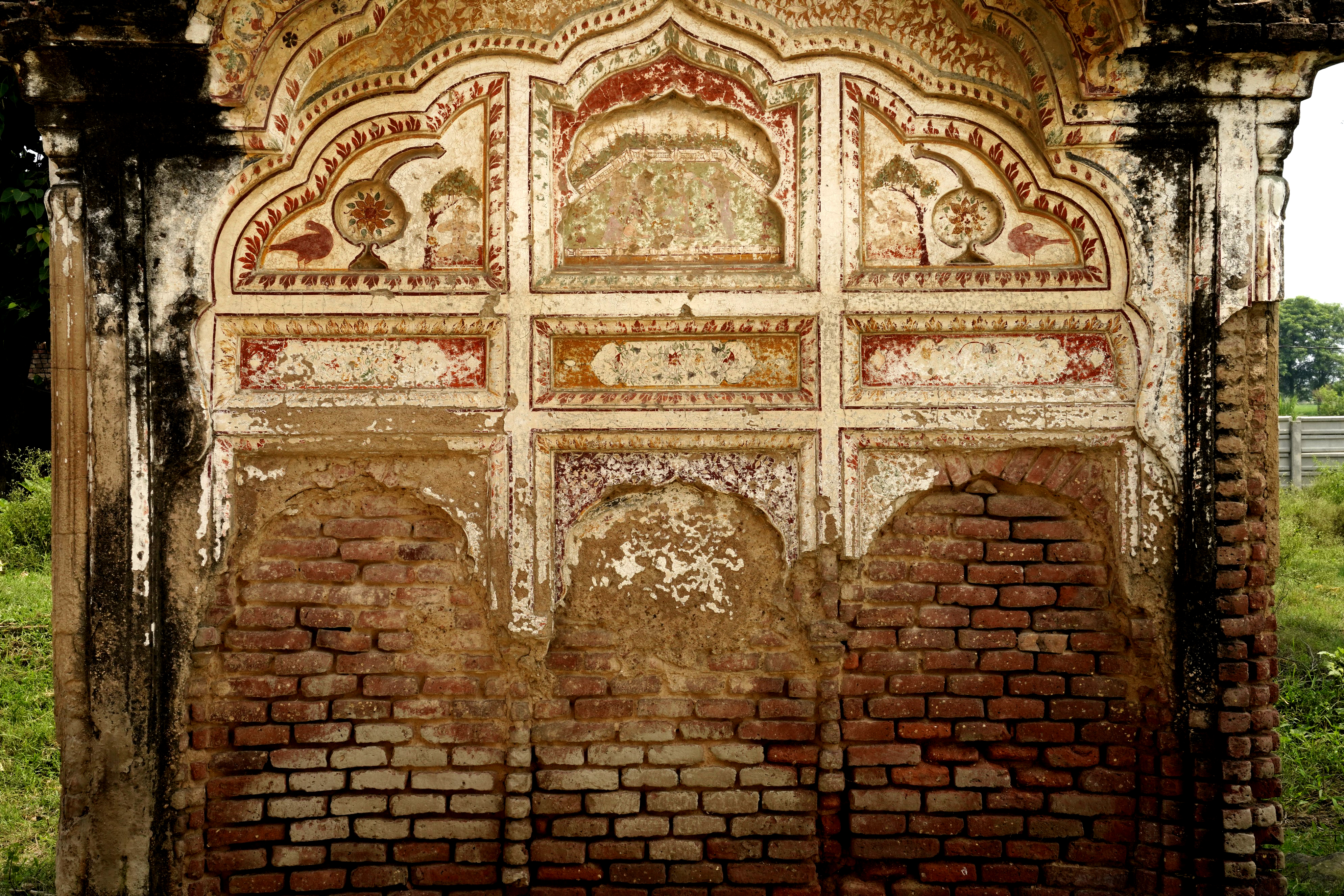 Religious hymns are inscribed on the four arches within the parikarma, accompanied by wooden ceilings with mirrored details at key points. The sukhasan, constructed from Nanakshahi brick with lime mortar, features lime-plastered exteriors ideal for fresco work. The entrance's multifoil arch retains faint frescoes depicting stories from Guru Nanak's life, despite significant weathering and vandalism.