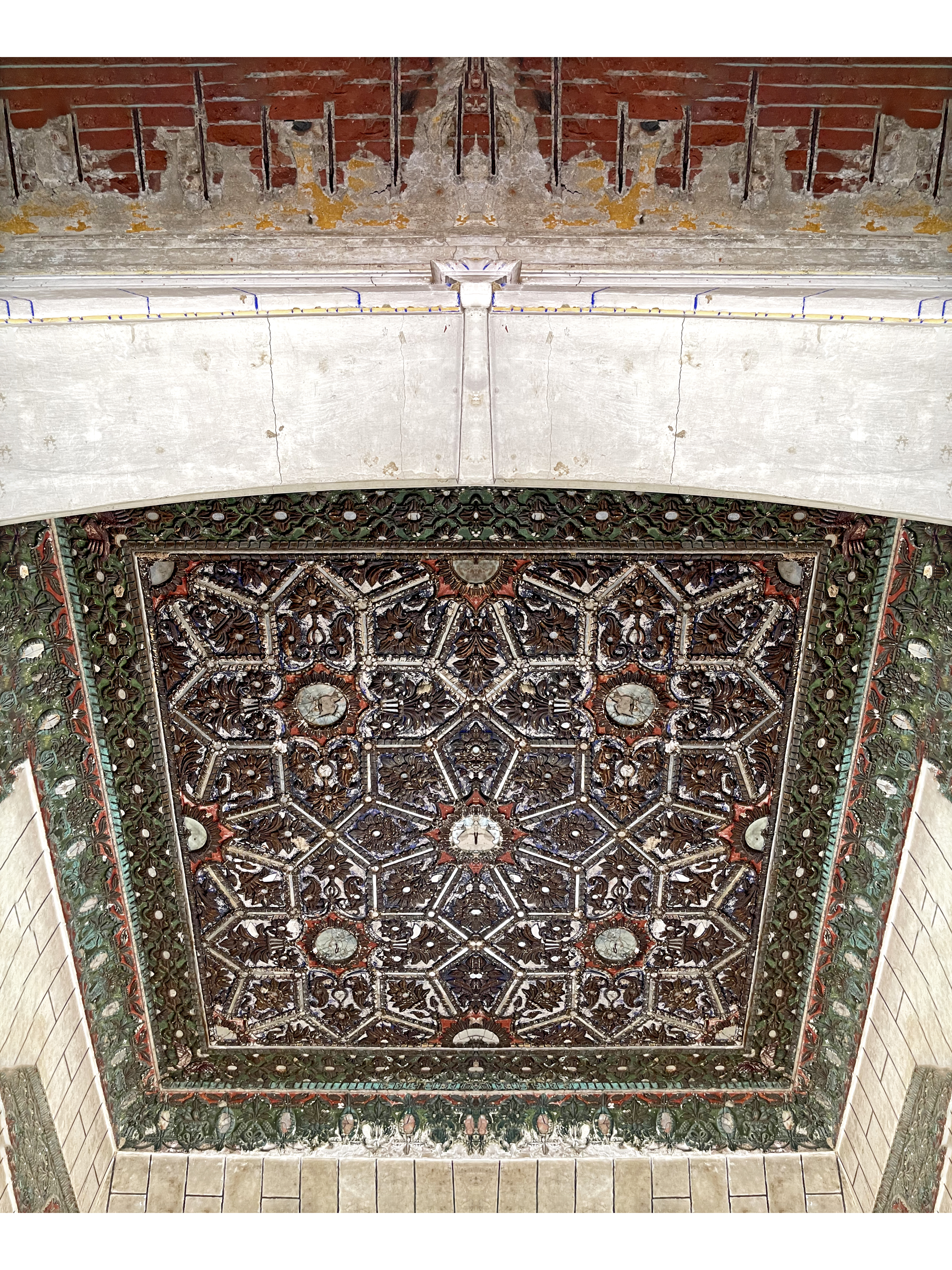 The first-floor arches and pilasters are adorned with red terrazzo outlined by yellow terrazzo bands, adding vibrancy to the otherwise subdued palette.