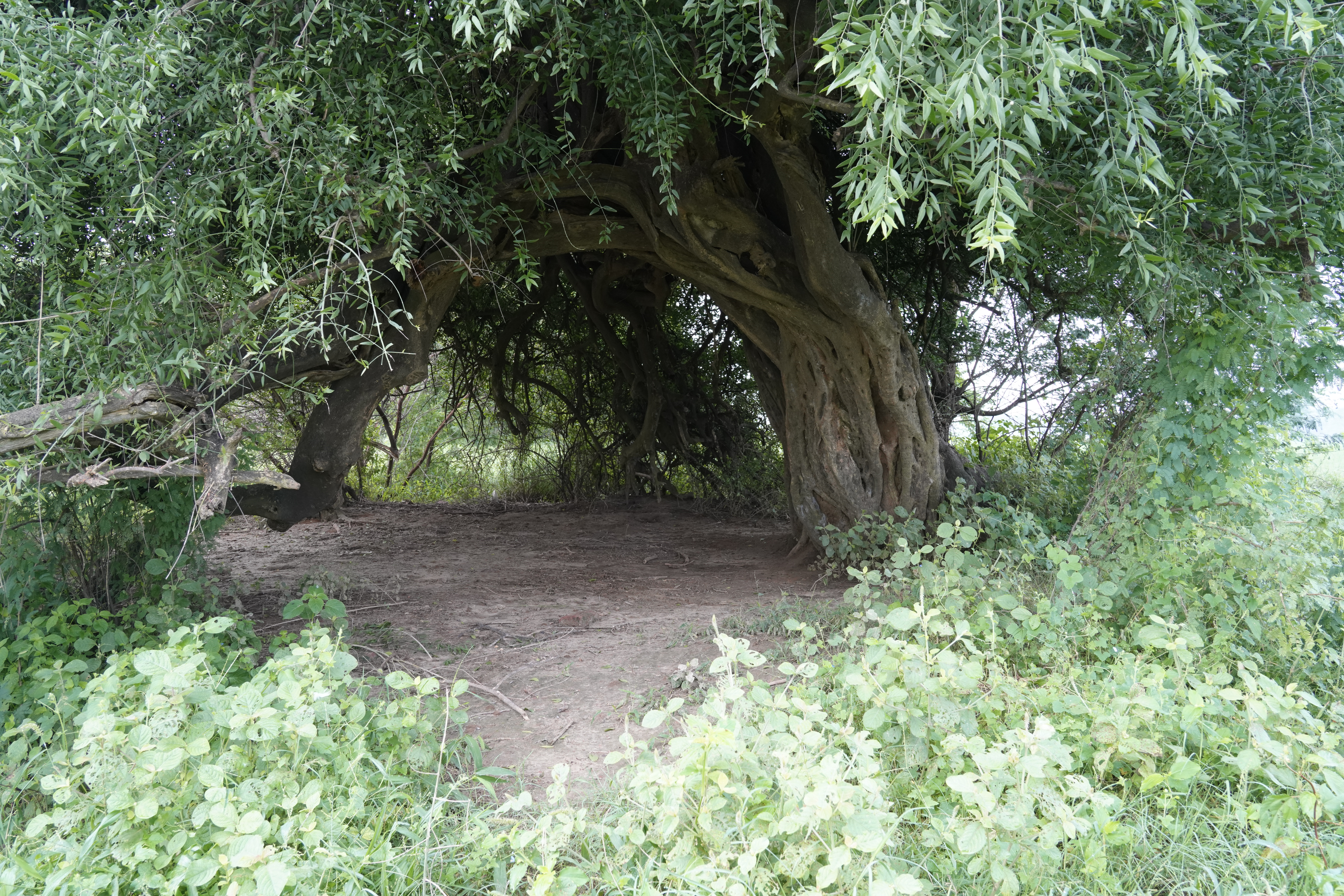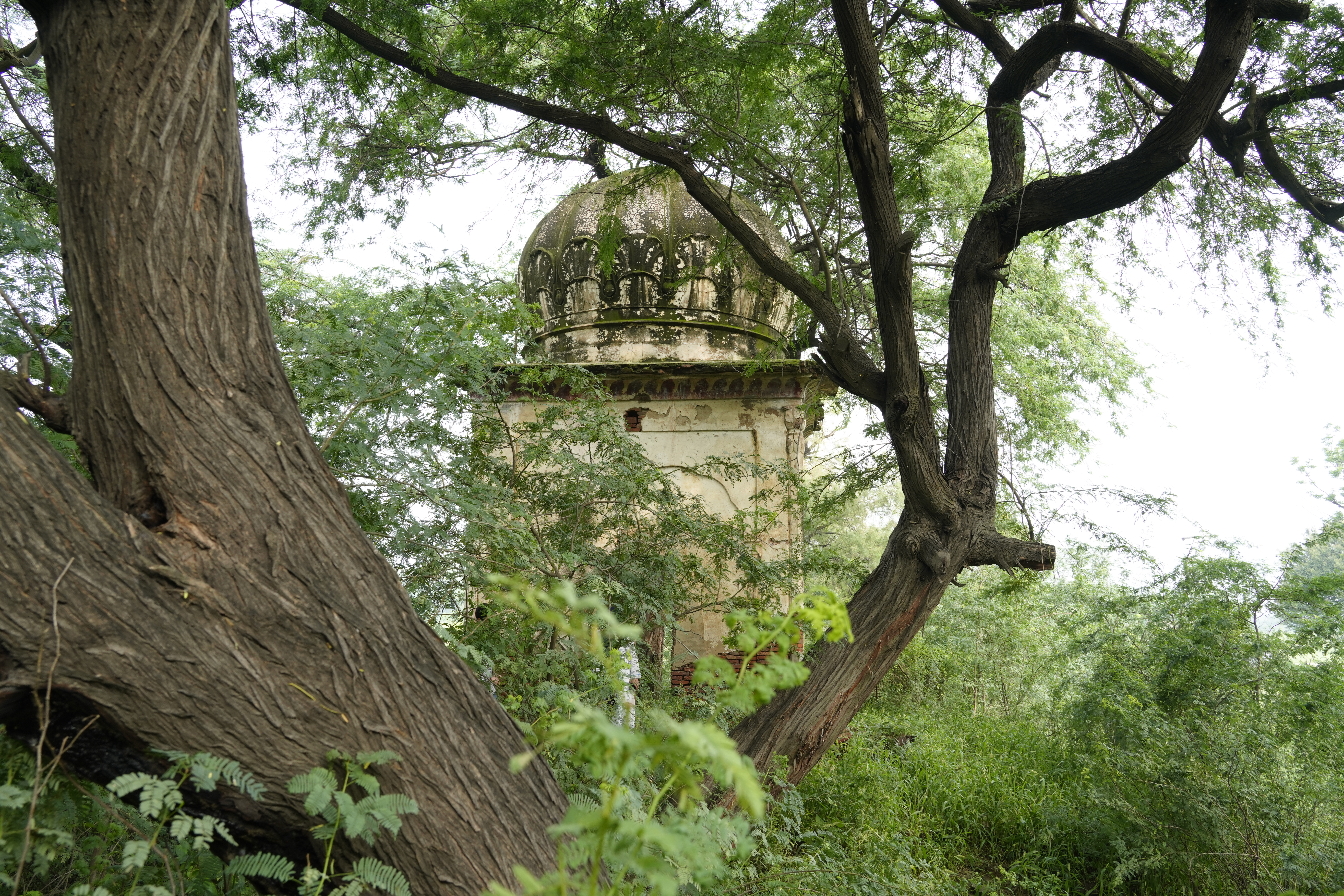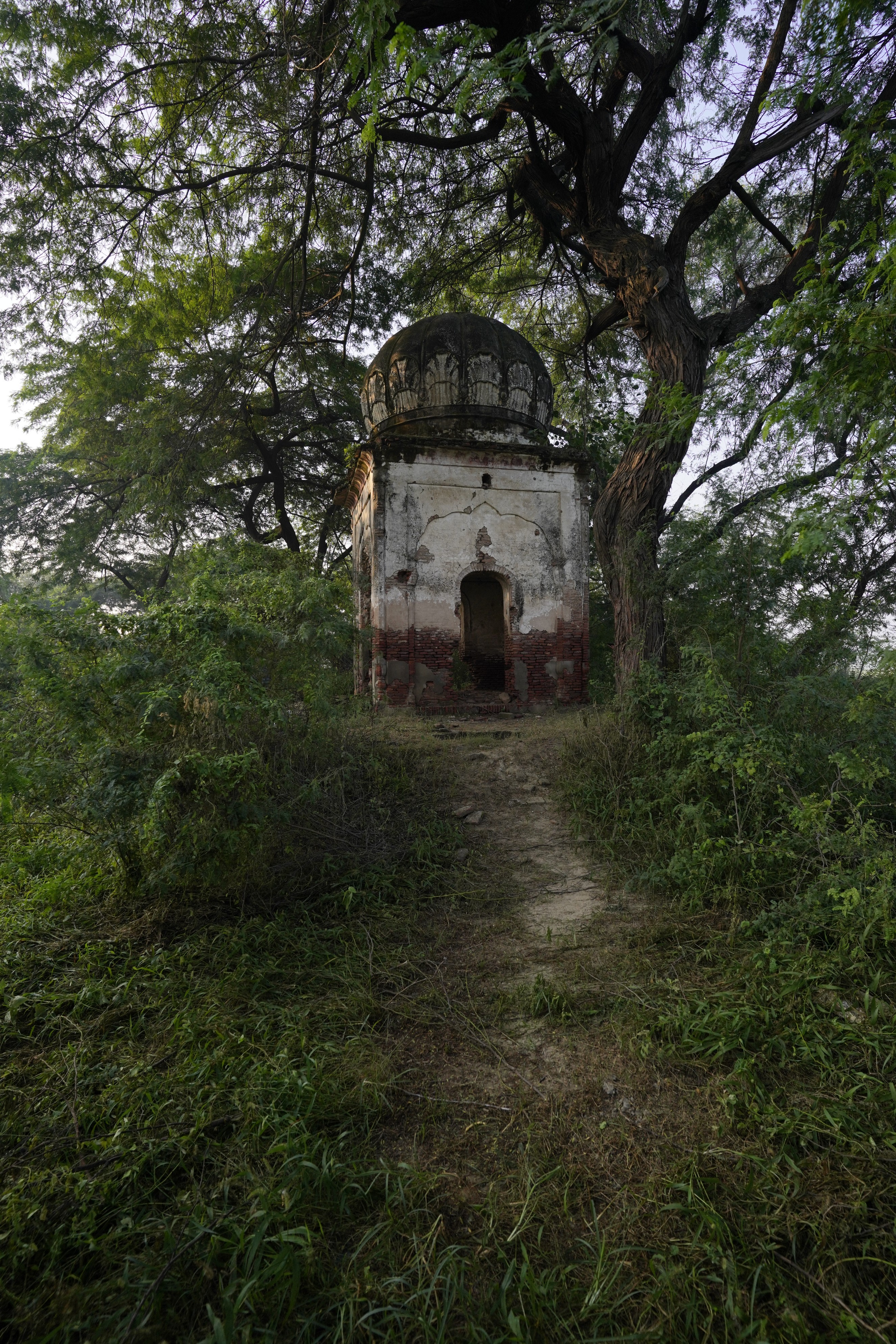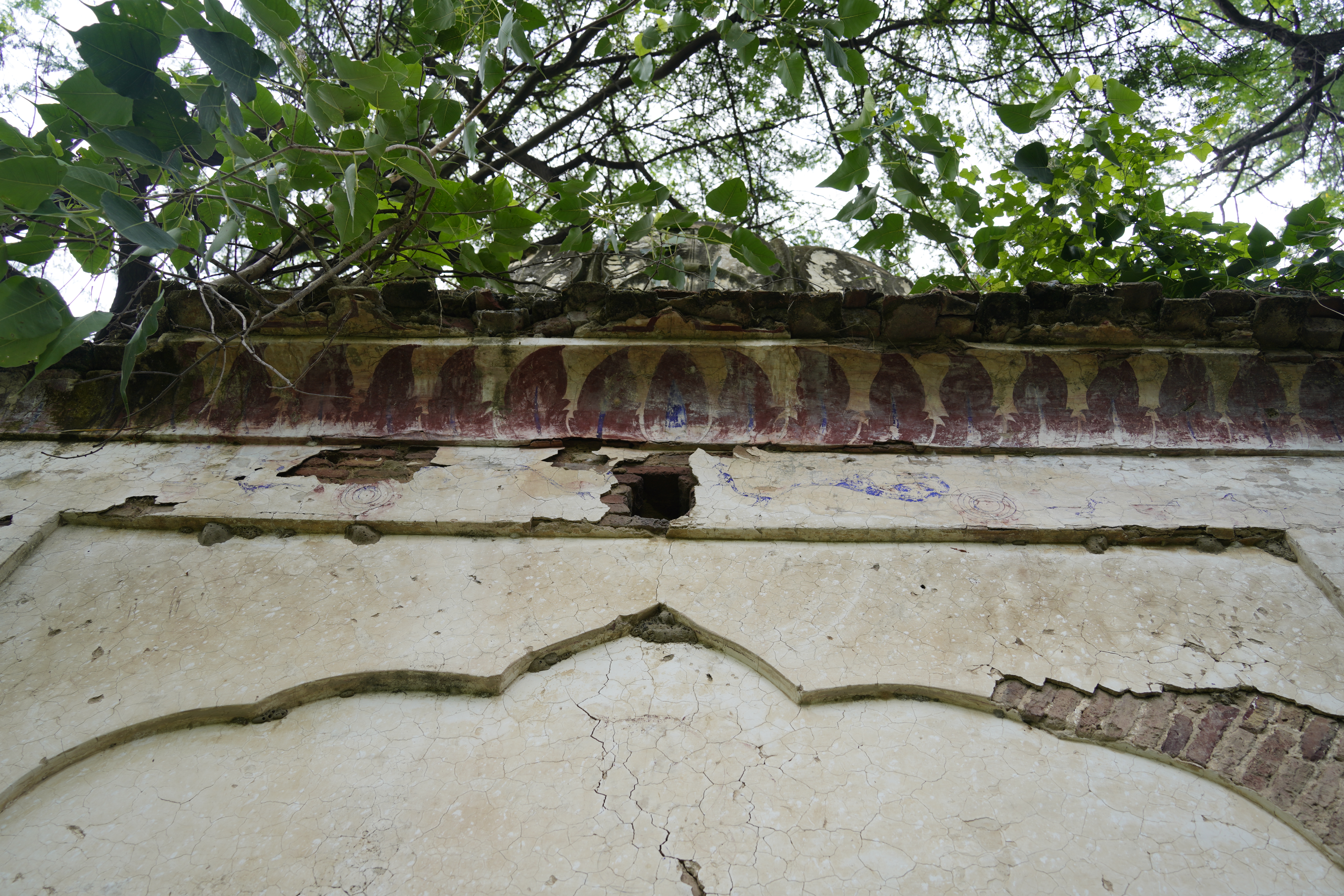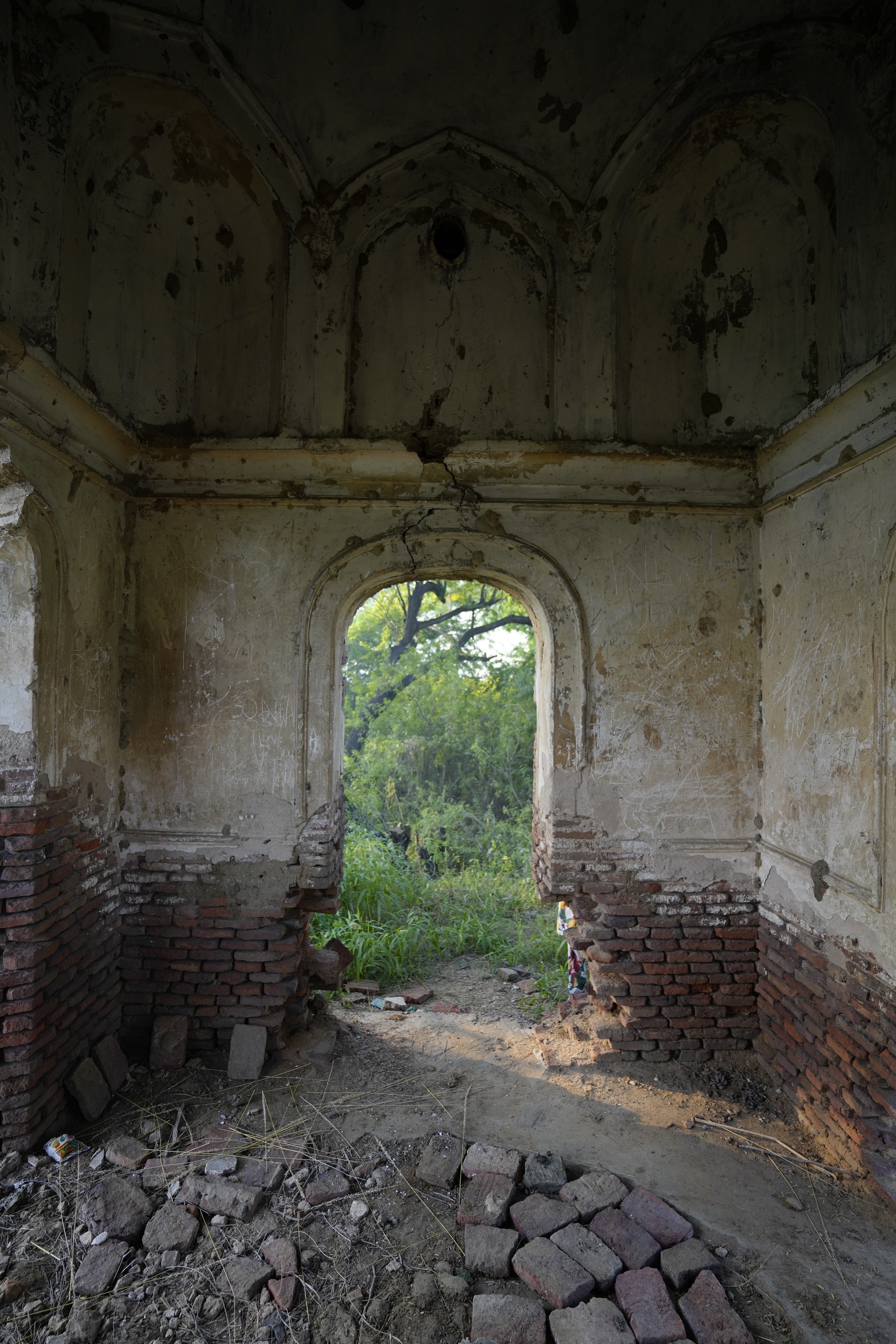 Waliullah Khan, in his book Sikh Shrines in West Pakistan (1962), has documented a photograph of a large entrance gate to the gurdwara at Ghowindi." However, no such structure can be found today in the village. There remains an eroded, small, square structure on the outskirts of Ghowindi, which the locals describe used to be a gurdwara once. It is made of exposed brick and is topped with a dome. The sarovar and a well have dried up. Surrounding the ruins are numerous trees, including a tall, bushy Lahura tree, whose lush and leafy branches hang low, almost touching the ground.