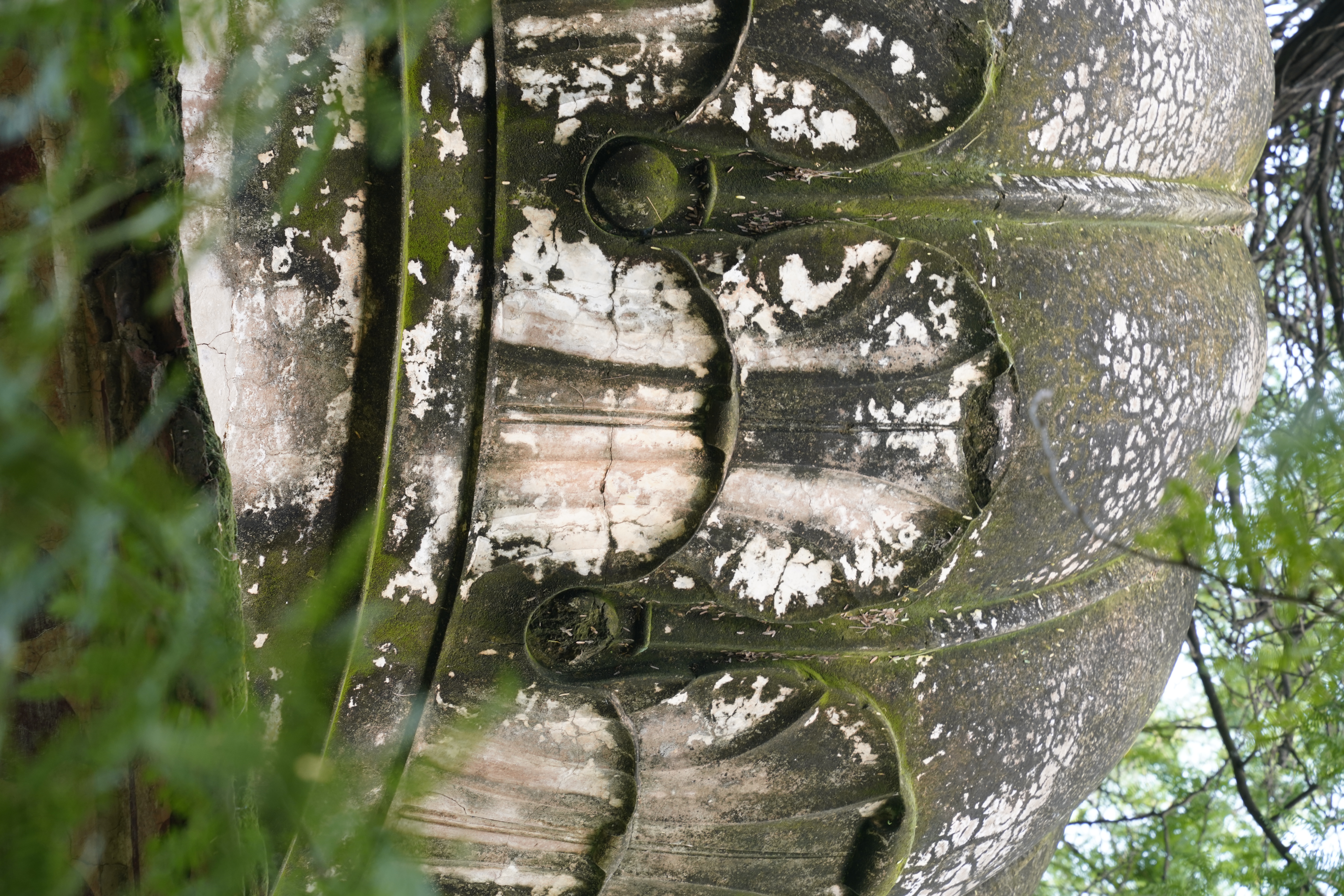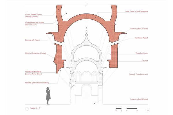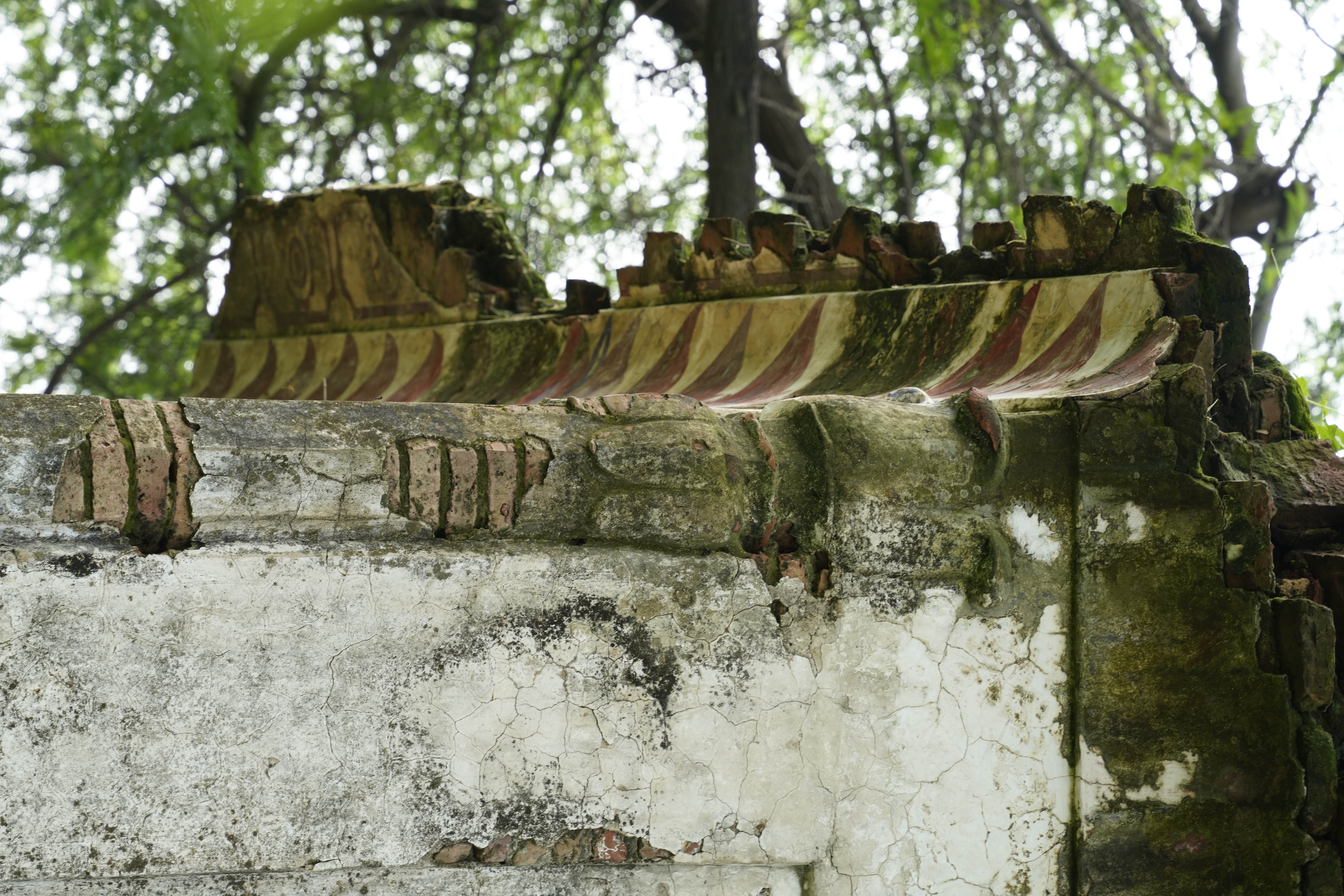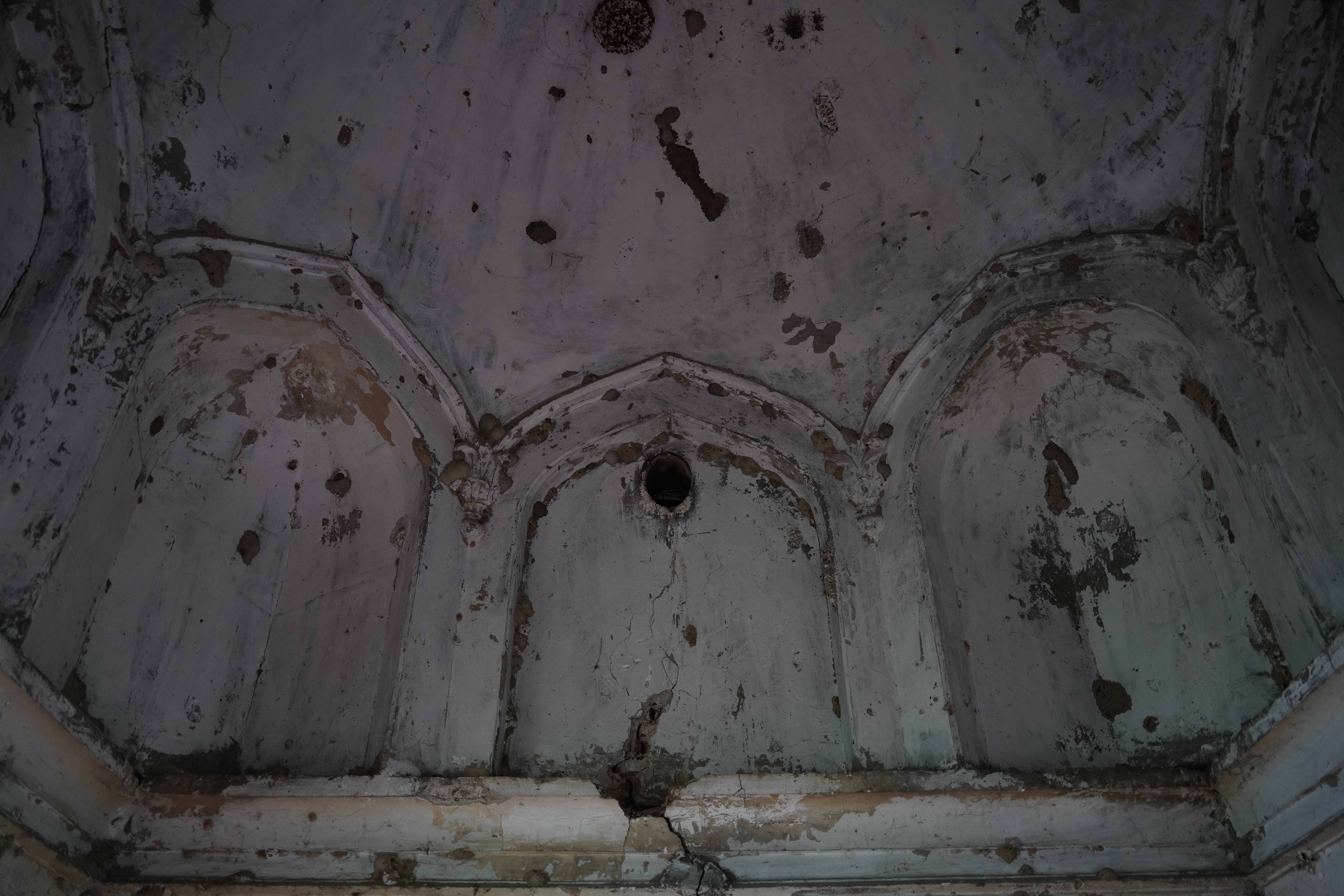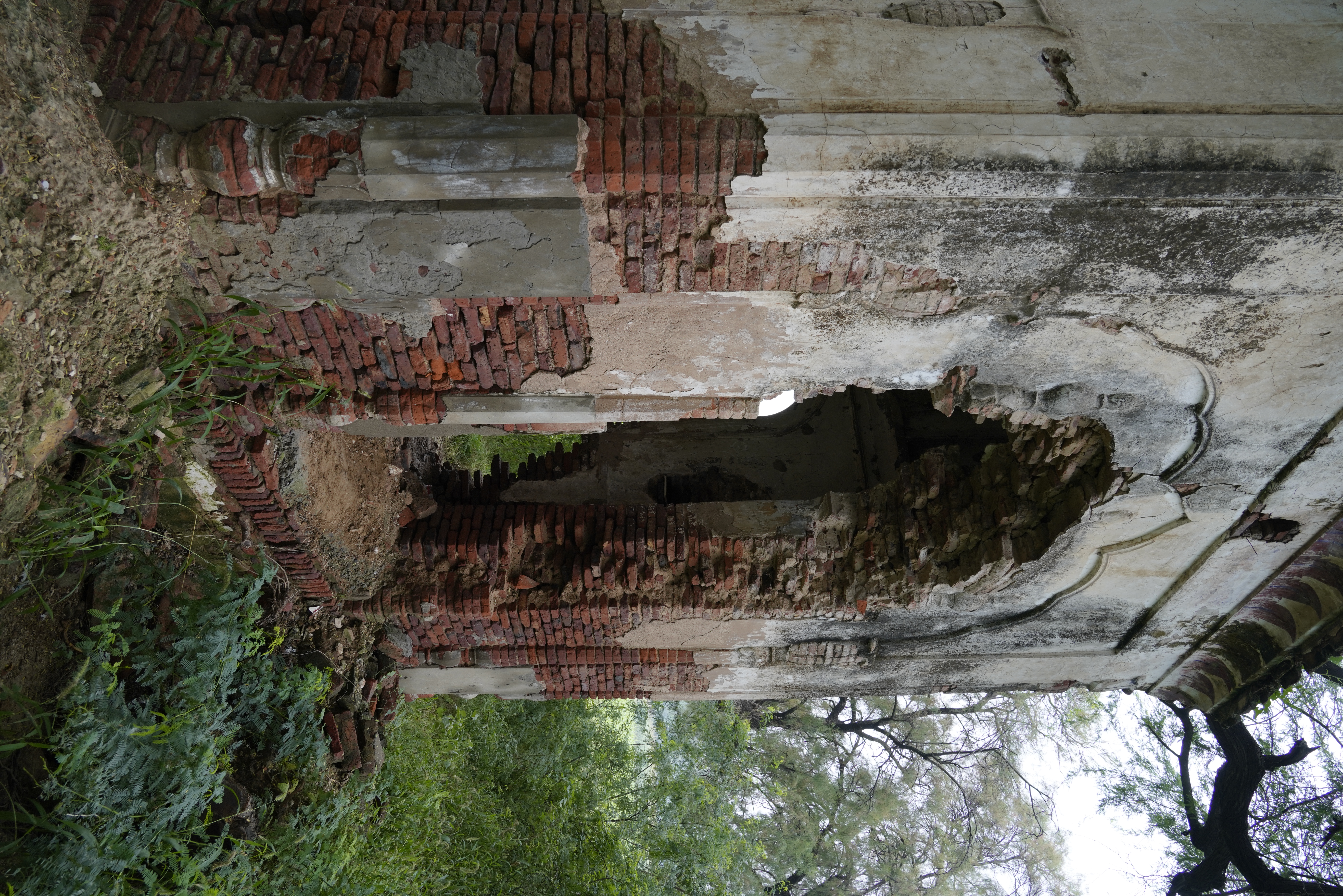 Waliullah Khan, in his book Sikh Shrines in West Pakistan (1962), has documented a photograph of a large entrance gate to the gurdwara at Ghowindi." However, no such structure can be found today in the village. There remains an eroded, small, square structure on the outskirts of Ghowindi, which the locals describe used to be a gurdwara once. It is made of exposed brick and is topped with a dome. The sarovar and a well have dried up. Surrounding the ruins are numerous trees, including a tall, bushy Lahura tree, whose lush and leafy branches hang low, almost touching the ground.