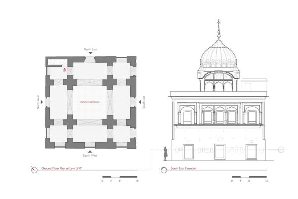 The Gurdwara's layout adheres to the archetypical rotated square plan, a design frequently observed in traditional Sikh religious structures. The central chamber, or Parkash Asthan, once housed the Guru Granth Sahib and is surrounded by a parikrama, enabling devotees to circumambulate as part of their worship. This symmetrical layout emphasizes functionality while symbolizing inclusivity, a hallmark of Sikh philosophy. The 12 entrances—three on each side, with one closed to accommodate a staircase—reinforce this sense of openness and accessibility. The Gurdwara is elevated on a modest six-inch platform, further enhancing its prominence.