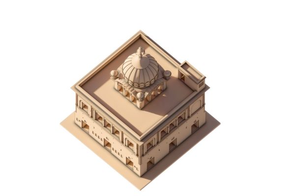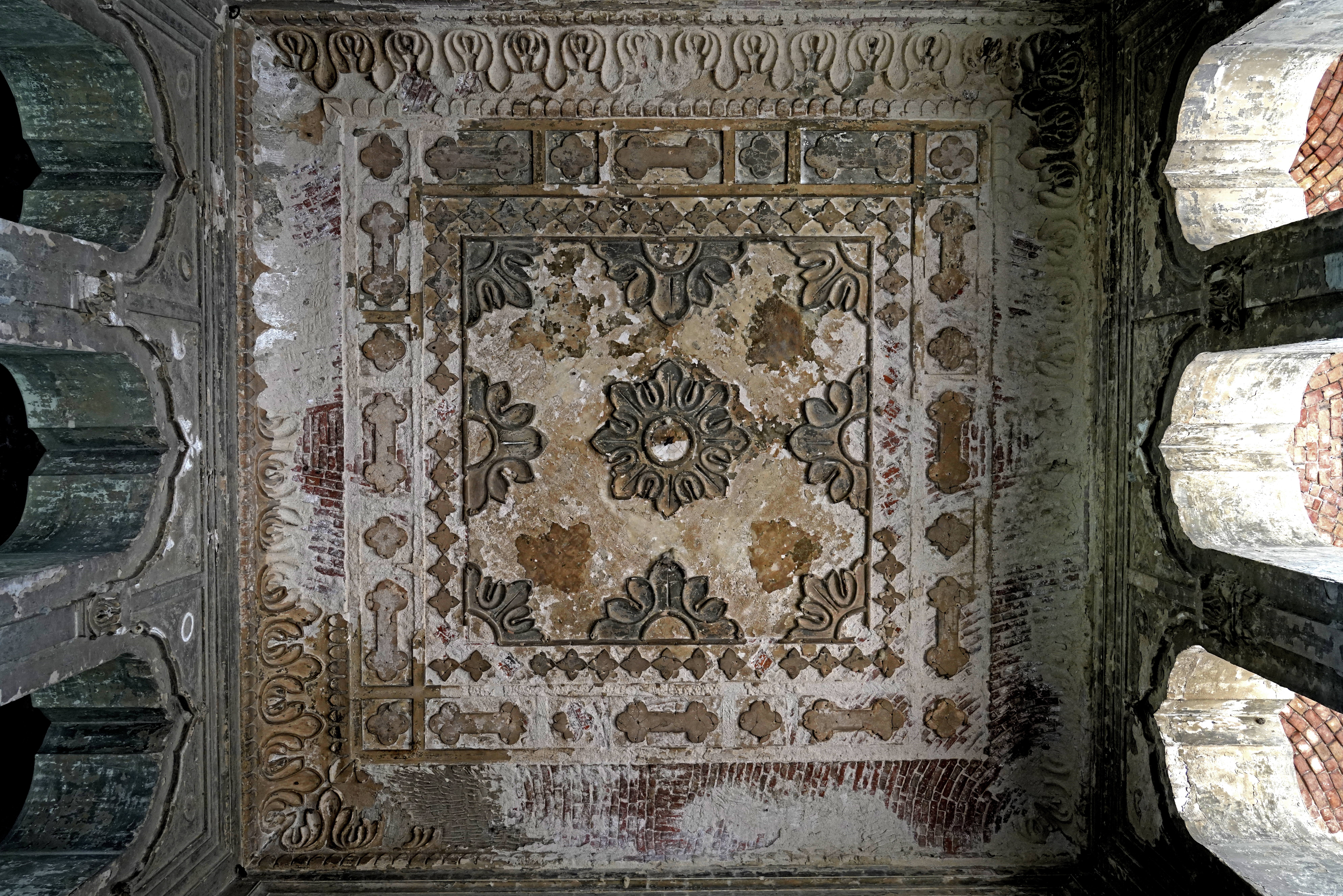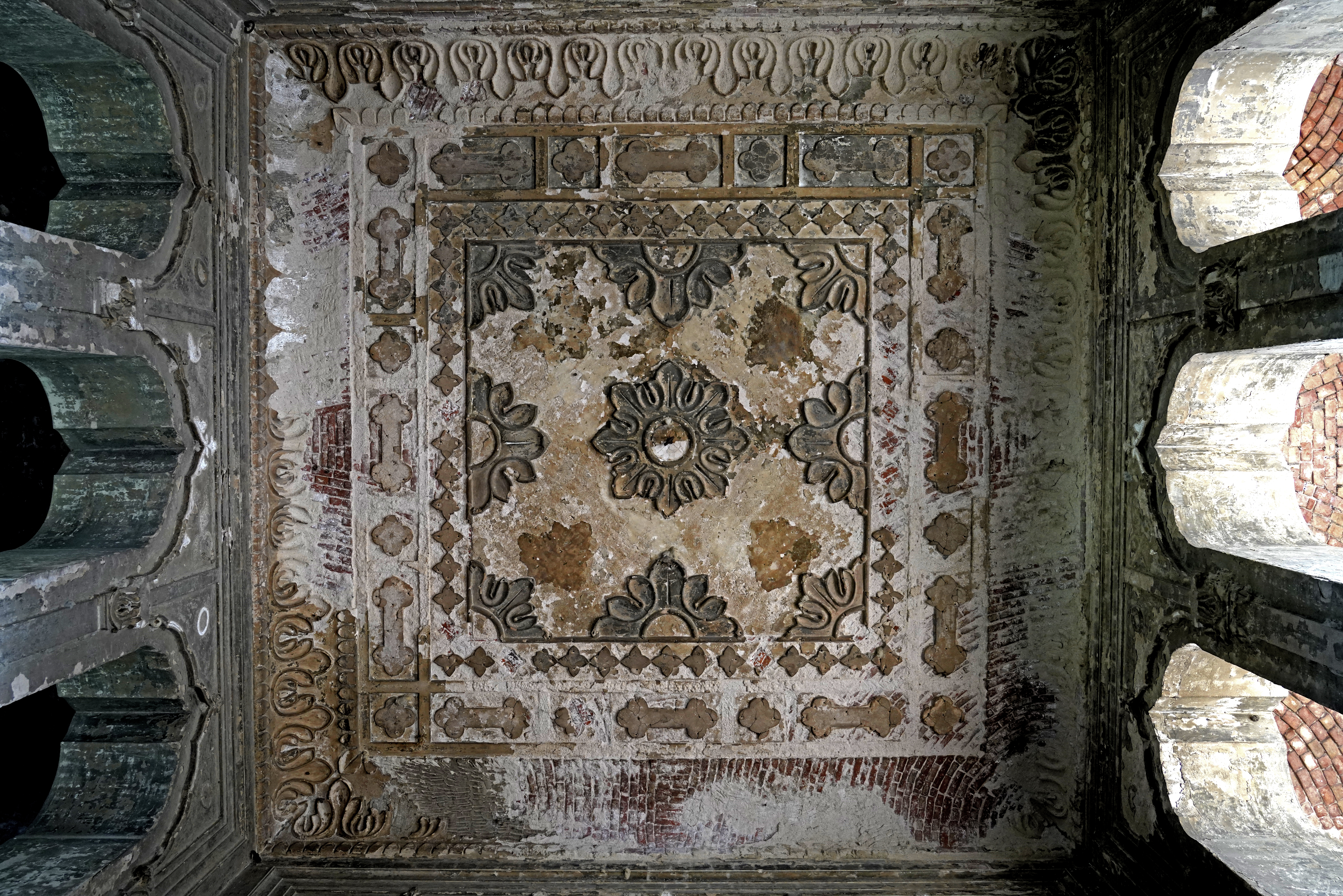 At the heart of the Gurdwara lies a double-height central chamber, which underscores verticality and grandeur. This chamber features intricate stucco work on its ceiling, adorned with motifs that closely resemble those found in the nearby Jawala Singh Haveli, linking the Gurdwara’s design to local artistic traditions. The dome, crowning the structure, is a defining feature. Adorned with a metal kalash, it exudes grandeur, with its scale and craftsmanship symbolizing the spiritual aspirations of the Sikh faith. The dome’s load is ingeniously transferred to the square base through corbelled pendentives supported by three-centered depressed arches, ensuring both stability and aesthetic elegance. The skyline is further enhanced by four domical turrets (gumtiyan) at the roof's corners, a characteristic feature of Sikh shrines.