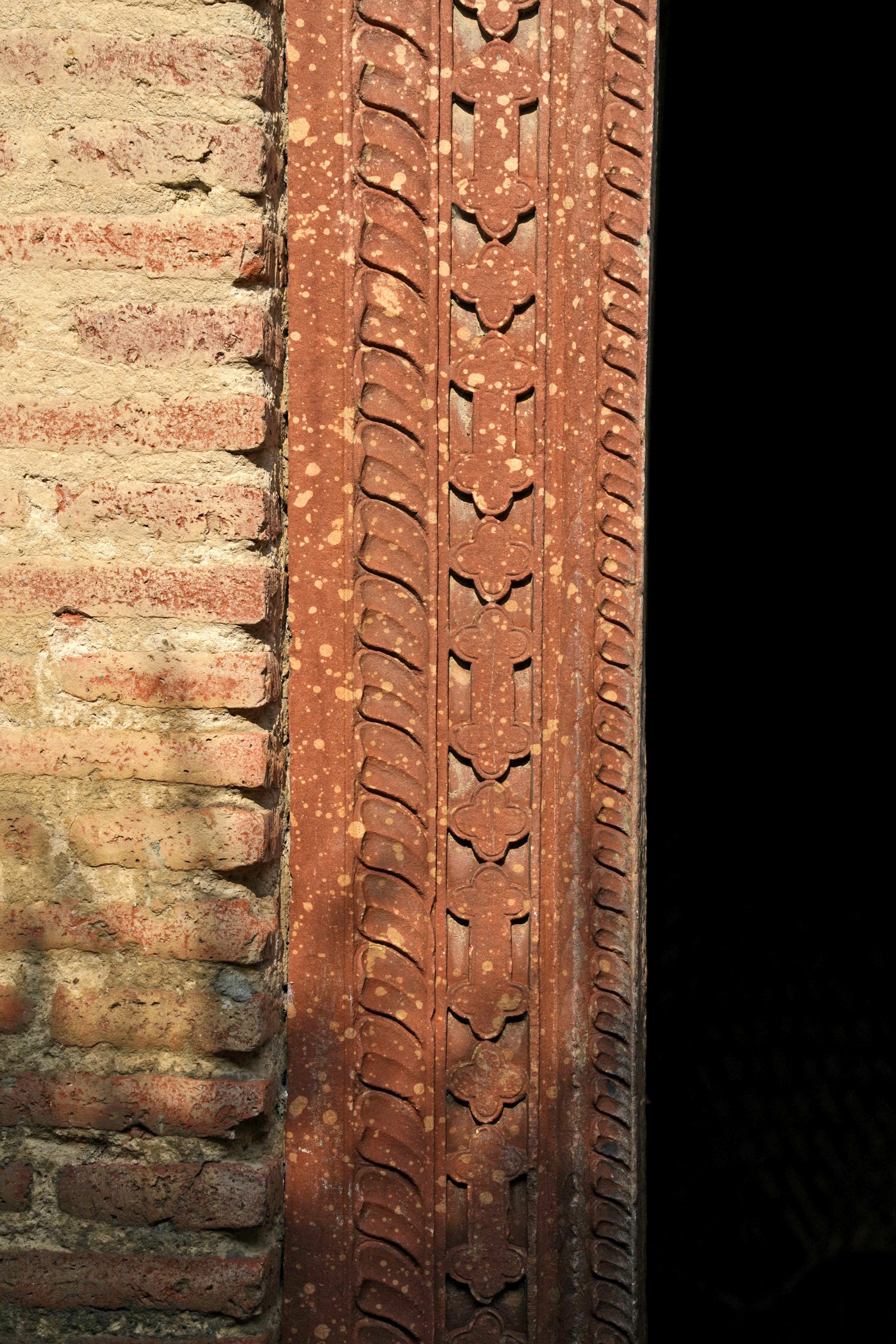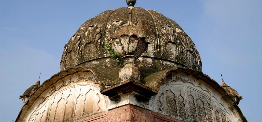 Gurdwara Patshahi Chevin in Padhana reflects an evolving architectural narrative that combines traditional Sikh design elements with later stylistic developments. The structure, constructed in two distinct stages, showcases a blend of Nanakshahi and colonial influences. The ground floor, attributed to an earlier phase, is built using Nanakshahi bricks, while the upper story and dome, added in 1940, employ standard- sized bricks (9x4.5x3 inches). This variation in materials serves as a tangible marker of its phased construction, with the architectural style transitioning from simple round arches on the ground floor to more complex ellipsoid and multi-foiled arches on the upper levels. This evolution reflects a growing sensibility in Sikh architectural aesthetics during the period.